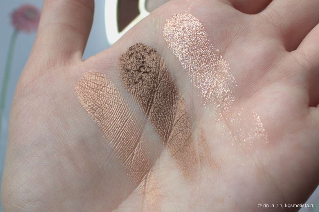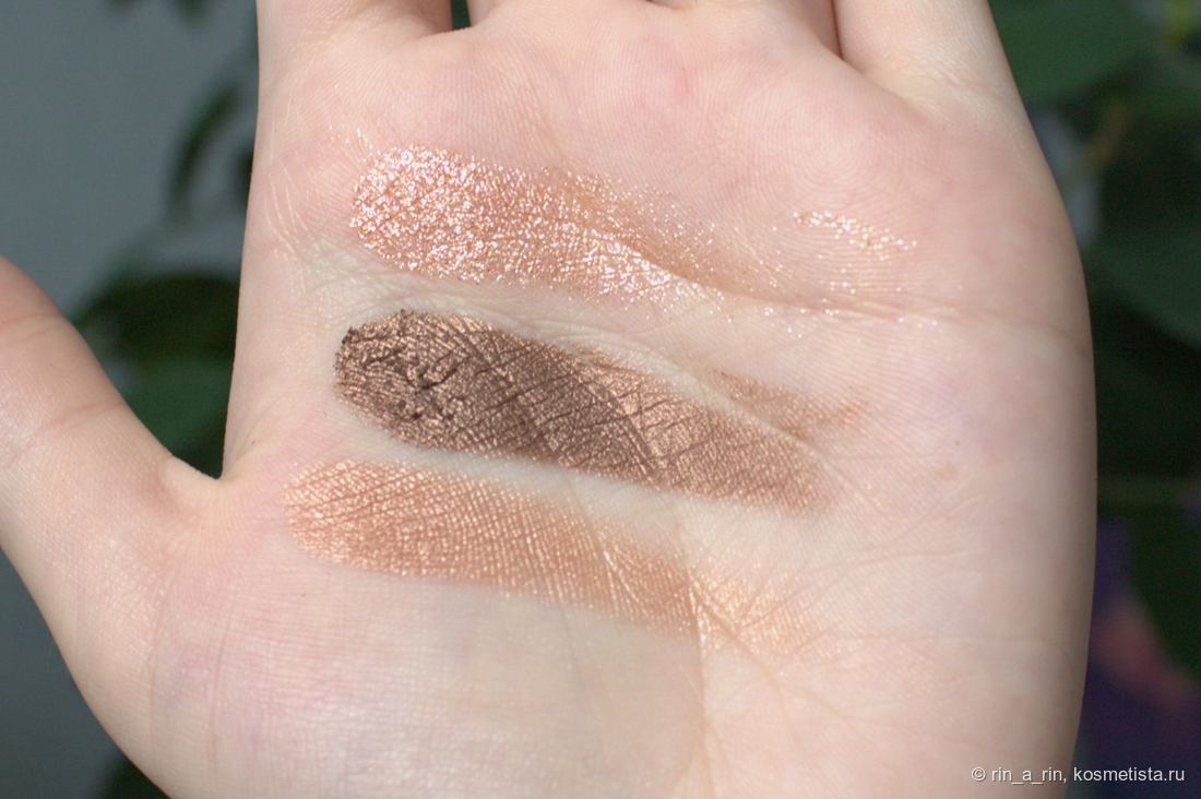 темный сатин (Night lid) — бронзовый, на ощупь более рыхлый и более податливый в сравнении со светлым сатином. На свотче видны его отдельные «чешуйки», которые вот-вот осыпятся, но с нанесением оттенка на веко никаких проблем в виде осыпаний нет;