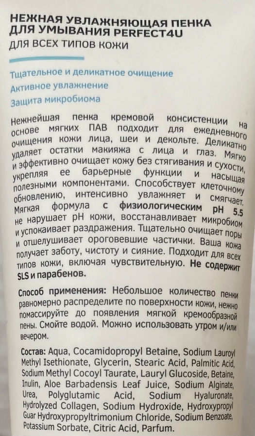 PERFECT4U Нежная Увлажняющая Пенка для умывания Hydration Cleanser pH 5.5