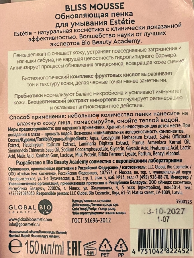 Пенка обещала деликатное, но эффективное очищение кожи с лёгким обновляющим эффектом. За это отвечают кислоты (гликолевая, молочная, яблочная) в составе, а пробиотики помогают сохранить липидный барьер и не пересушить кожу.