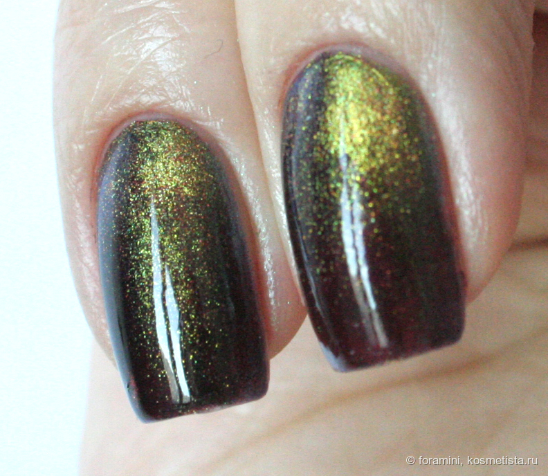 Темно-бордовая база с желто-зеленым магнитным шиммером, который при больших углах преломляется в синий. В зависимости от толщины слоев, бордовая база может выглядеть практически черной.