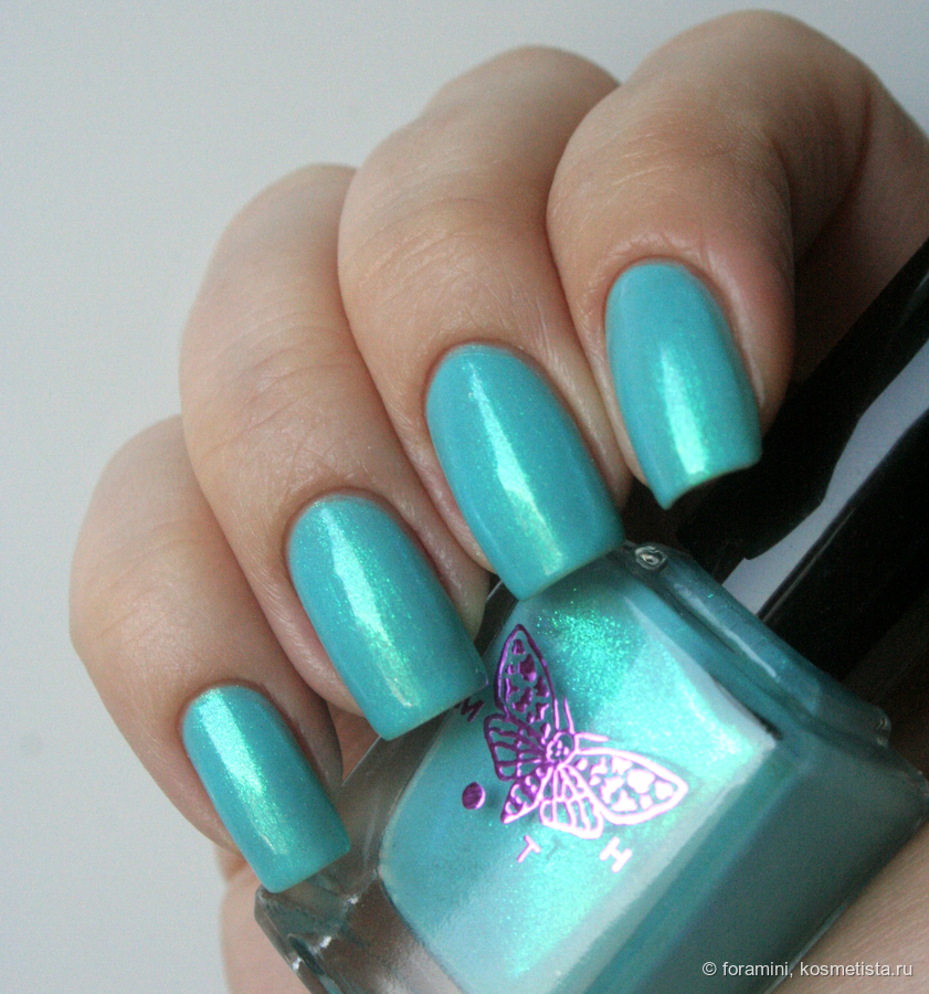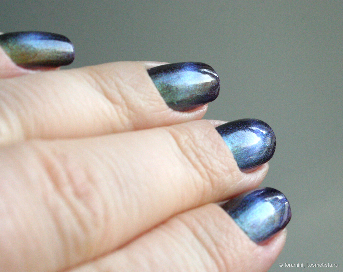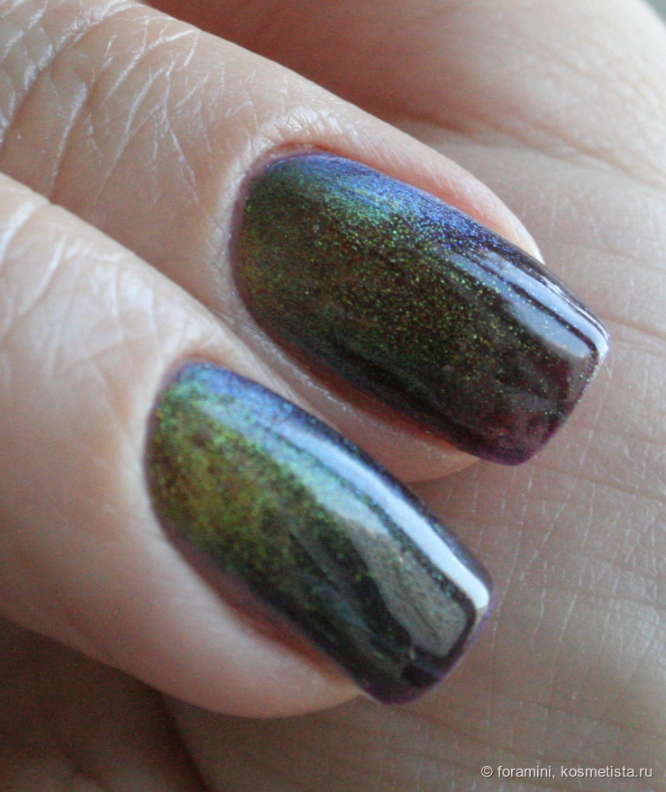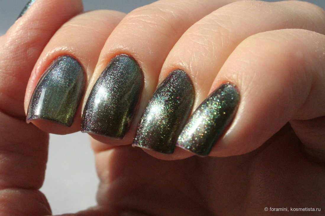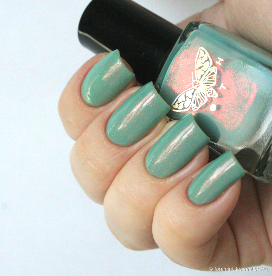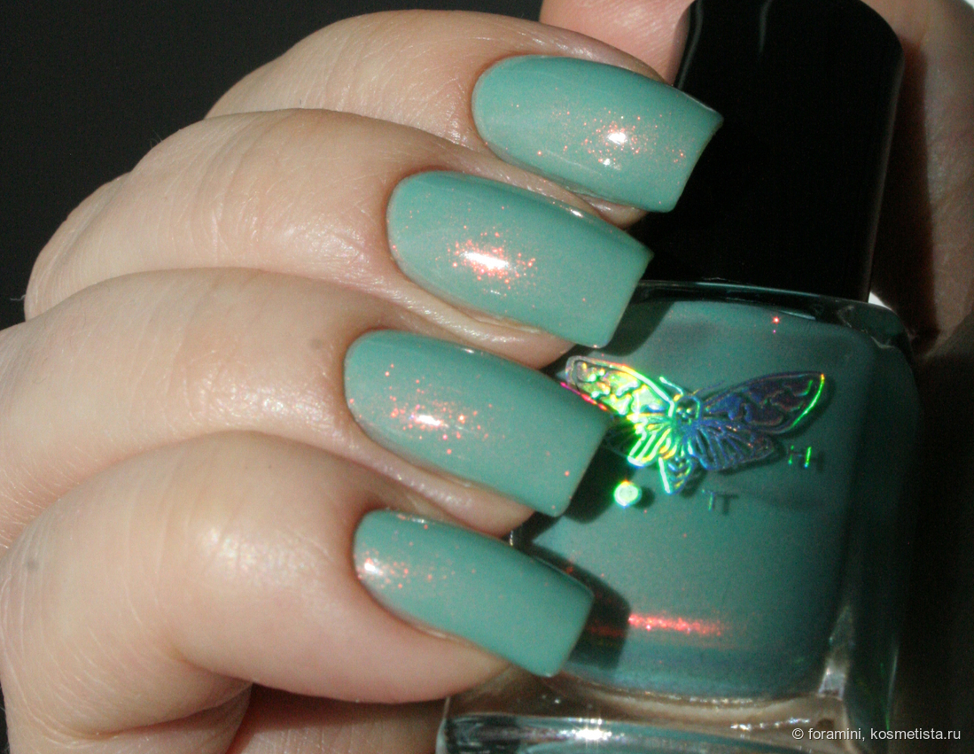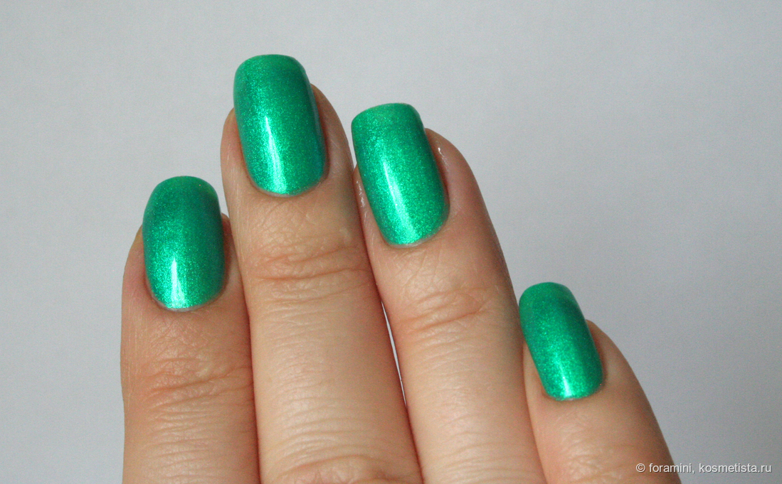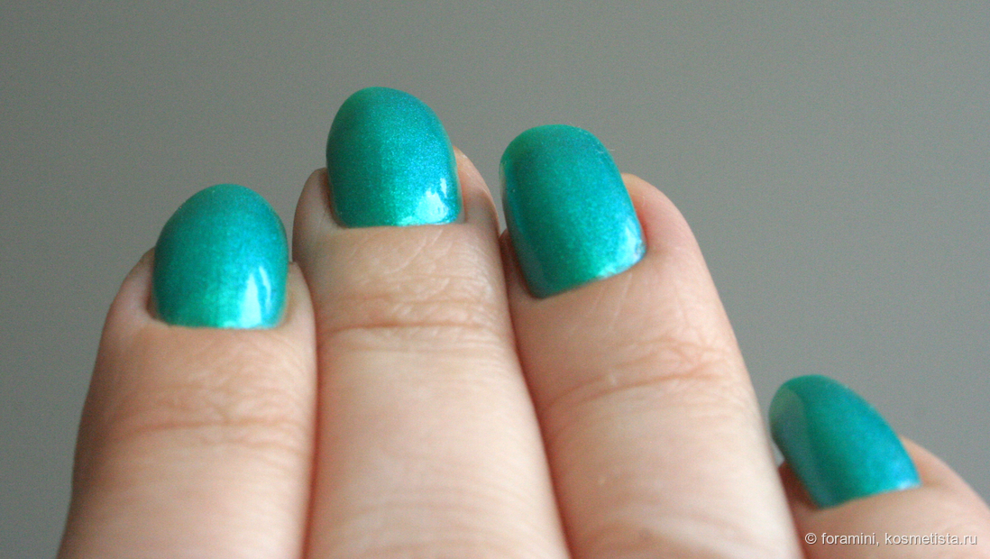 Изумрудно-зеленый шиммерный лак, отливающий в голубой. Красивый летний оттенок, но не уникальный.