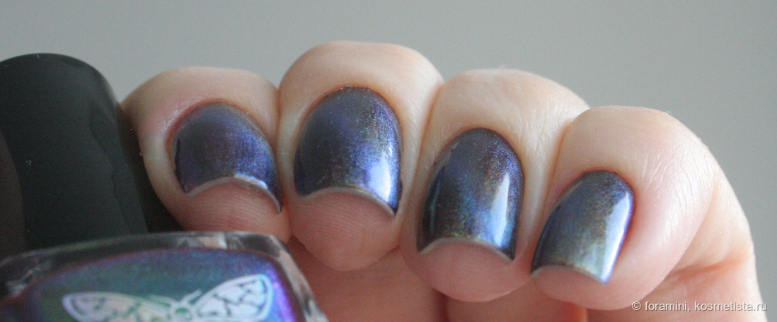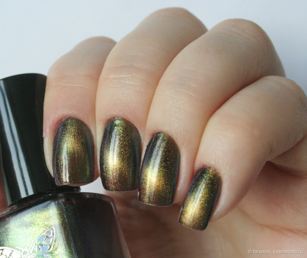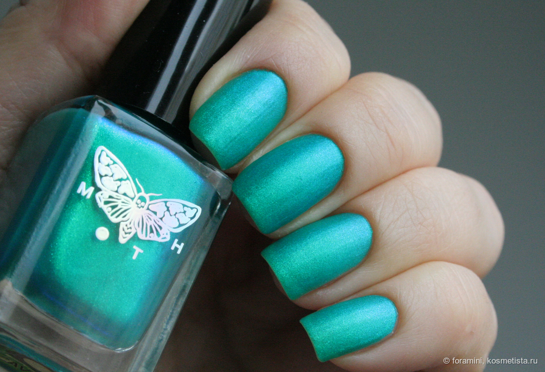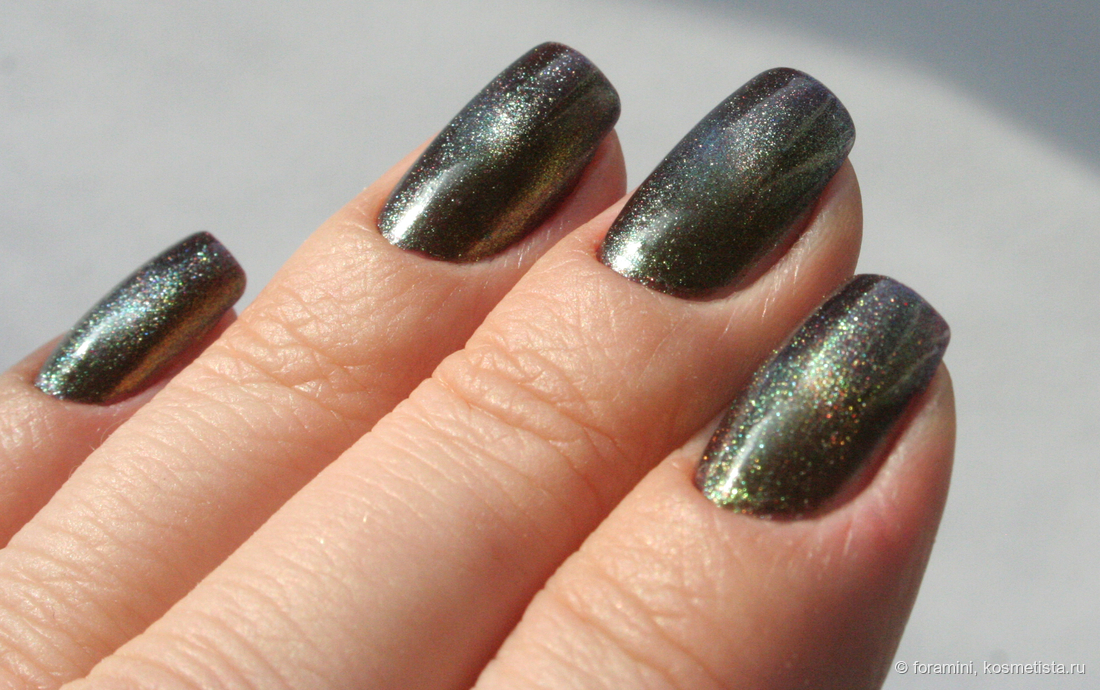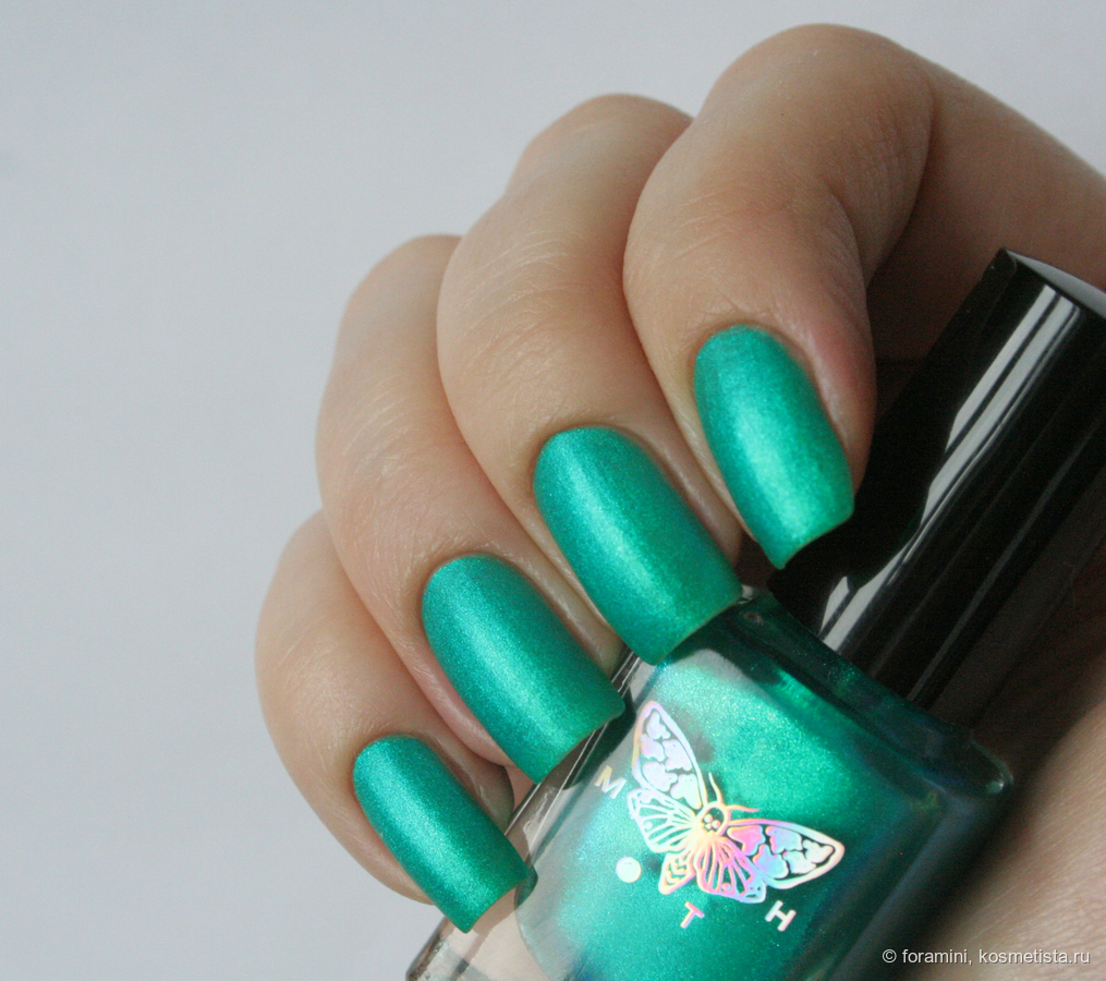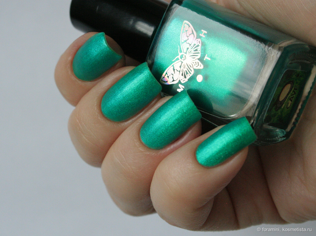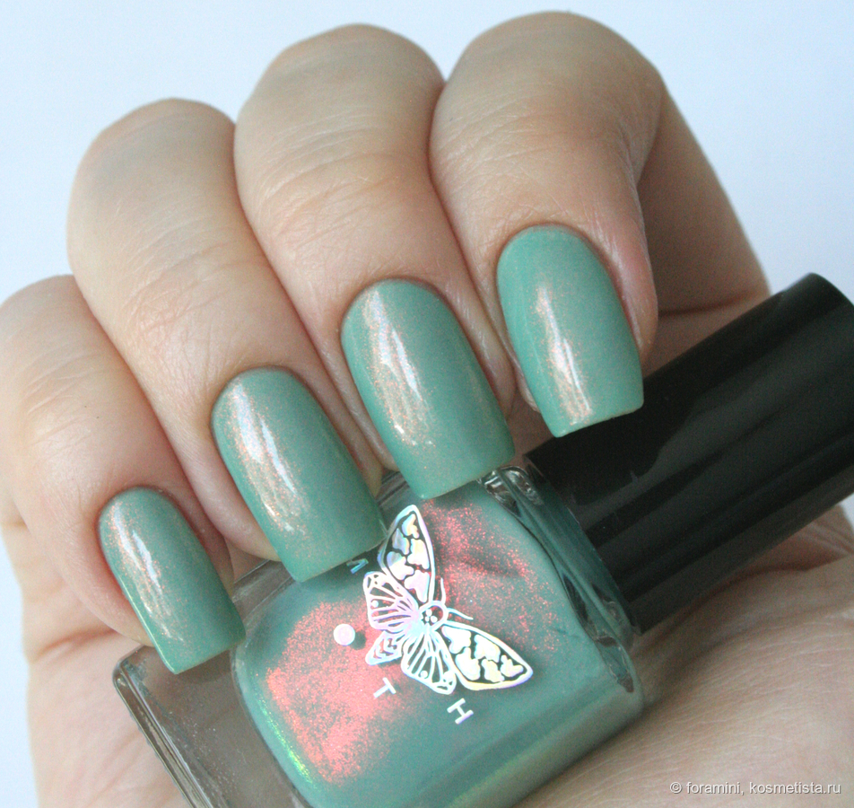 Изумрудно-зеленый шиммерный лак, отливающий в голубой. Красивый летний оттенок, но не уникальный.