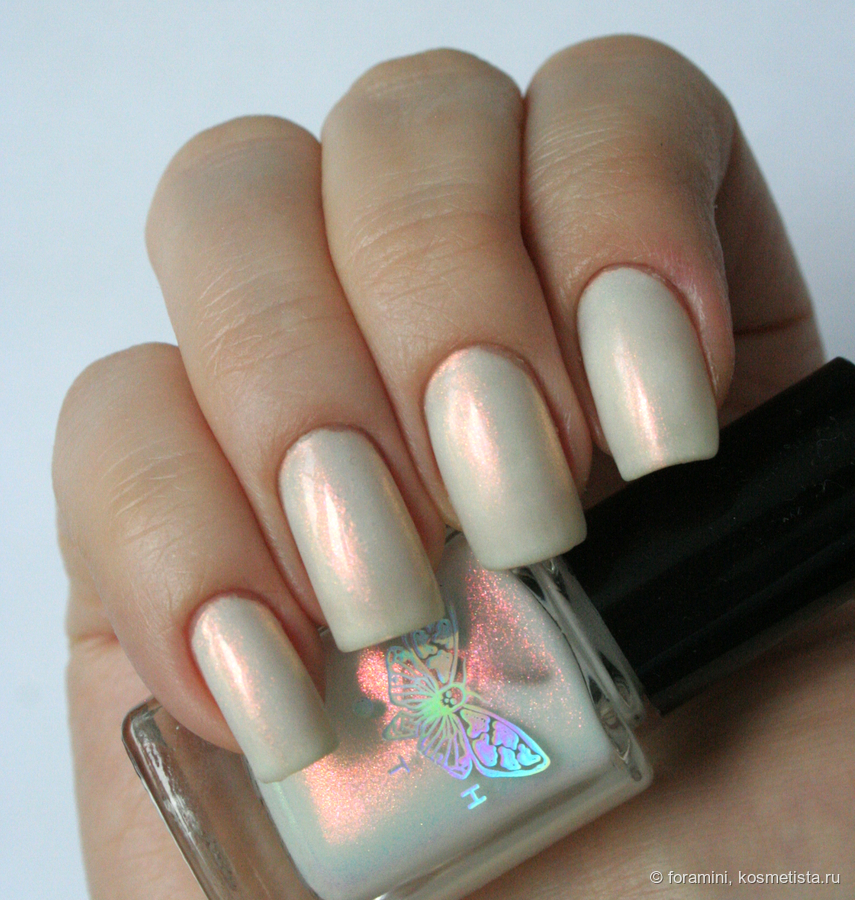 Розовый шиммер с переливами в желтый и зеленый в молочной базе. База оказалась слишком прозрачной для моих ногтей, будет хорош в качестве топа, лак соло без подложки мне не понравился. При наслаивании (у меня 5 слоев!!) приобретает зеленоватый оттенок.