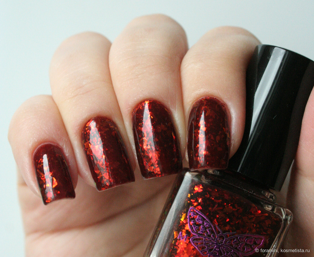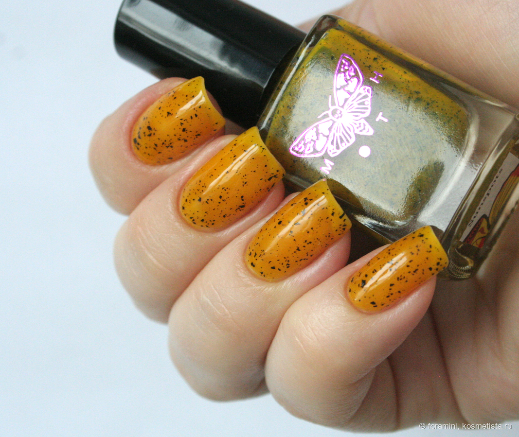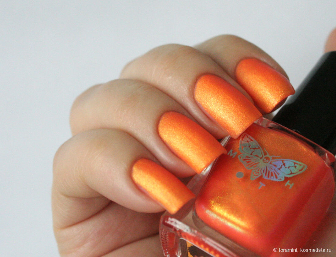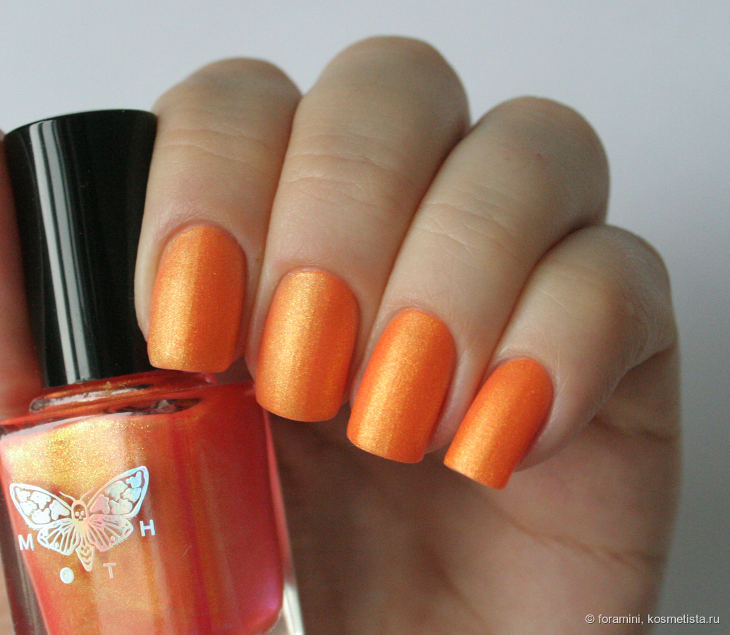 Морковный неон с золотым шиммером. Лак, который требует продуманного образа в целом. Как инди-задумку я его оценила, но в носке он требует дополнительного внимания к подбору одежды.
