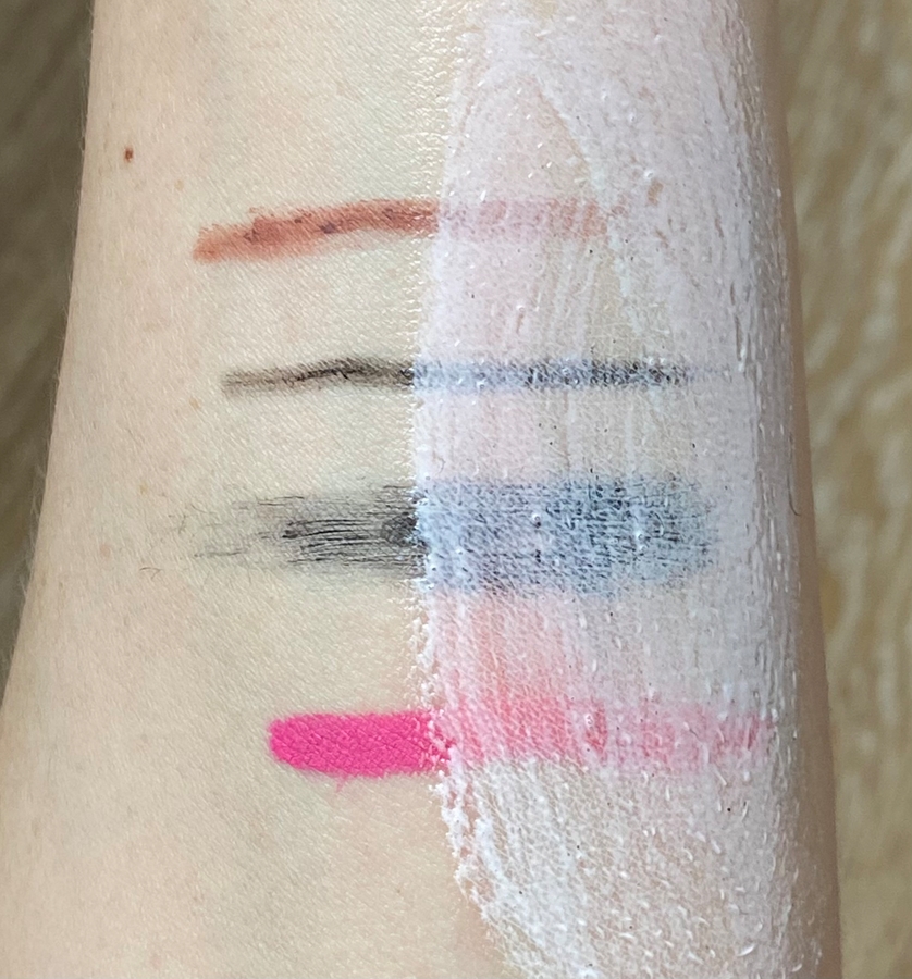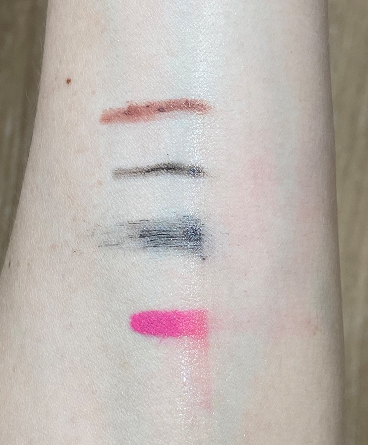 На руку я нанесла сверху вниз: карандаш для губ, карандаш для глаз и тушь для ресниц Vivienne Sabo, помада Romanovamakeup.