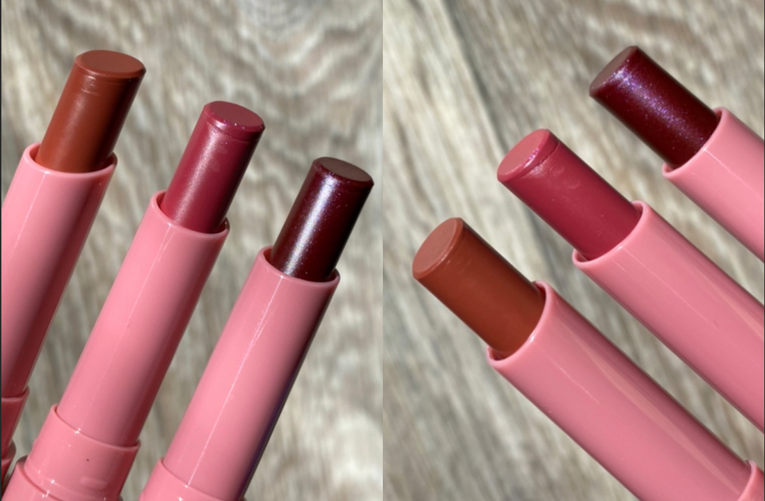 На свотчах на руке они выглядели как лёгкие тинты, но на губах раскрылись иначе. Так выглядят эти помады в один слой при разном освещении, сверху вниз: 08, 09, 10.