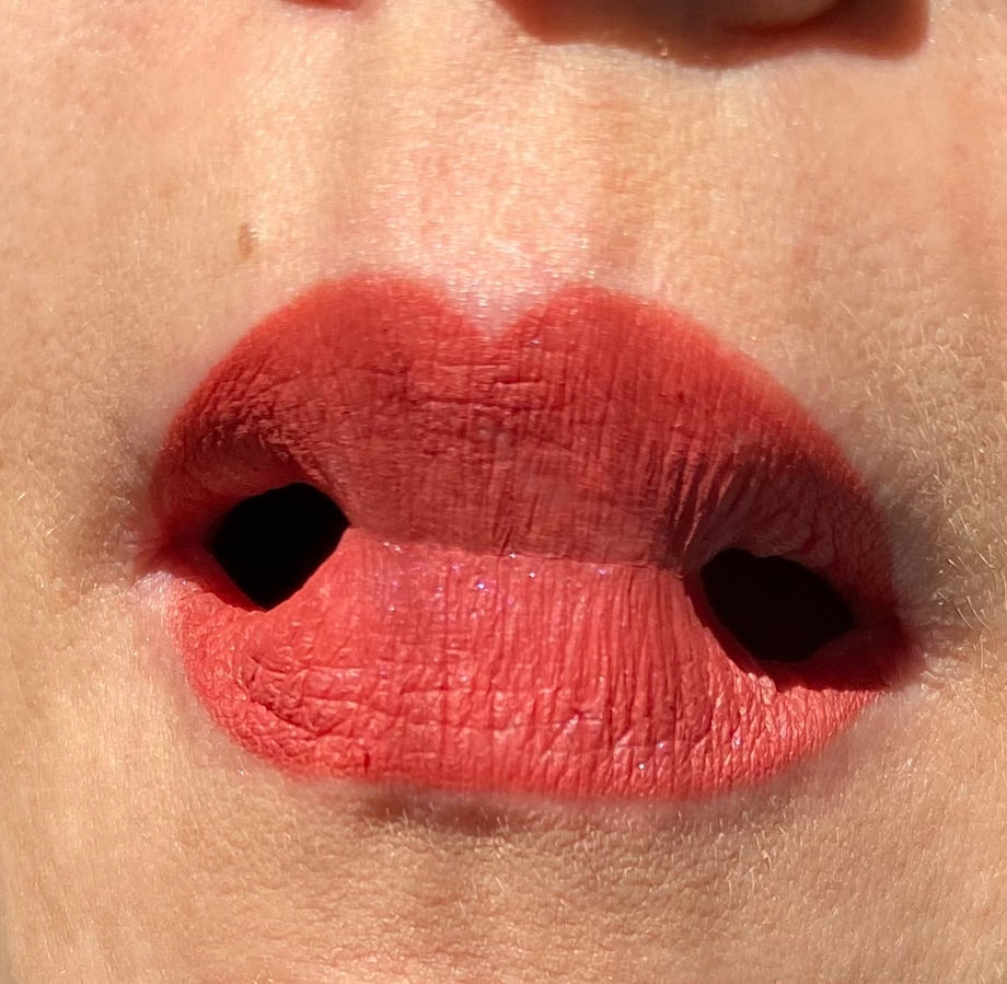 Действительно винный оттенок. На солнце заметен очень мелкий шиммер, но на губах он виден только в расфокусе и совсем не ощущается.