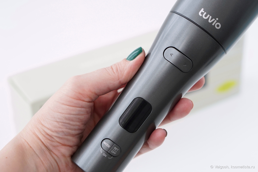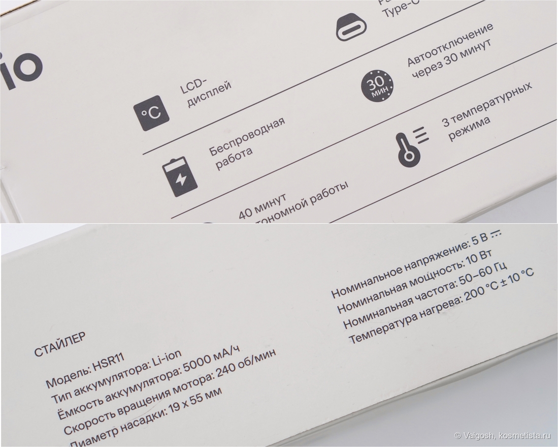 Штука компактная, беспроводная и в целом вполне удобная, на одном заряде работает сорок минут (что довольно много, мне этого хватает на три-четыре укладки), заряжается не дольше смартфона — около часа-полутора.