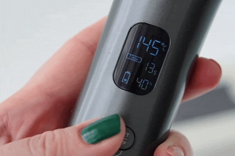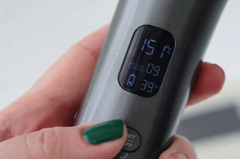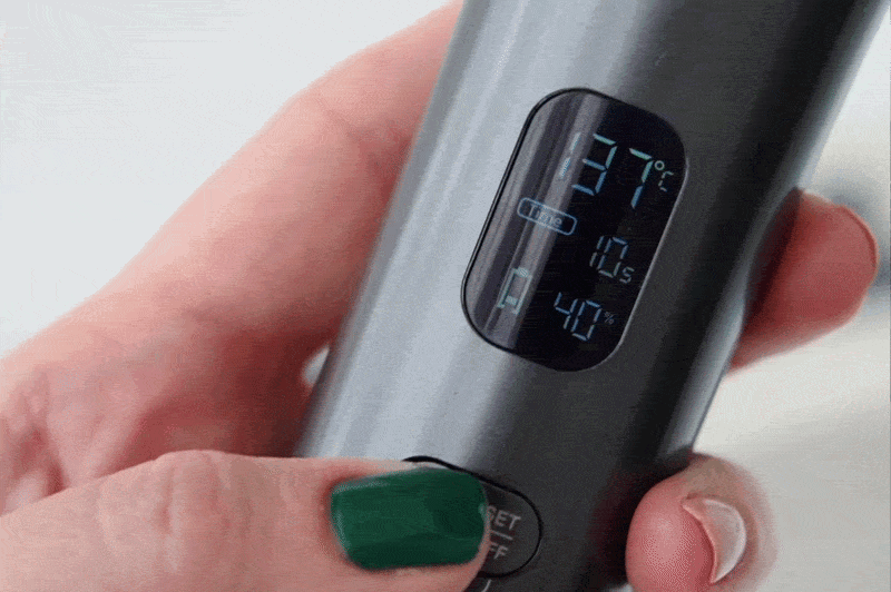Тут пока ничего интересного: вехняя строчка показывает текущую температуру, средняя — длительность нагрева пряди, нижняя — процент заряда. Для того, чтобы включить стайлер, зажимаем обе кнопки сразу, чтобы выключить — удерживаем кнопку set/off.