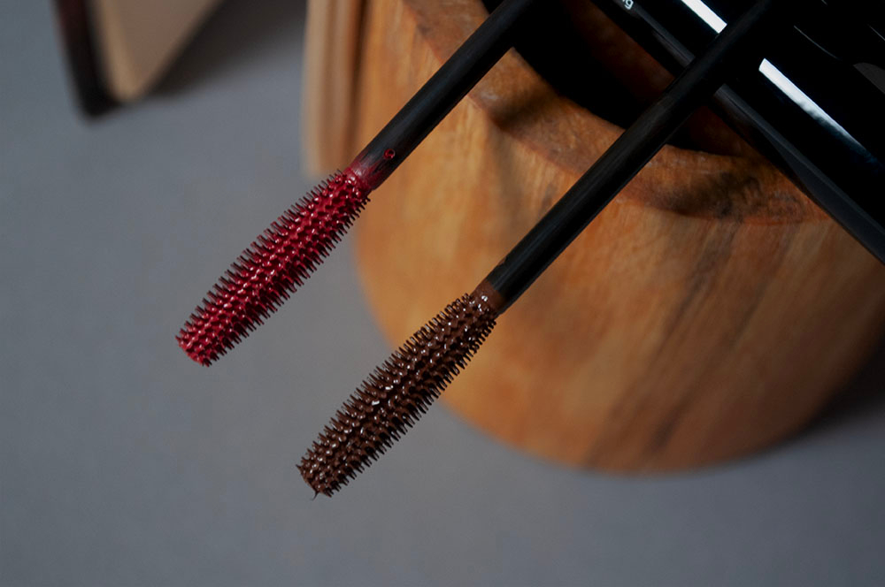 Щеточки одинаковые — щетинки частые, длинные и еще сильнее удлиняются к середине. На мой вкус и глаз это одна из самых удобных форм из возможных. Знаю что многие считают аппликатор этой туши слишком колючим, я не могу его оправдать в этом плане, но мне достаточно комфортно, я всего пару раз как-то укалывалась об него (а это уже третий флакон коричневой туши и первый бордовой), так что это, наверное, зависит от ресниц и аккуратности.