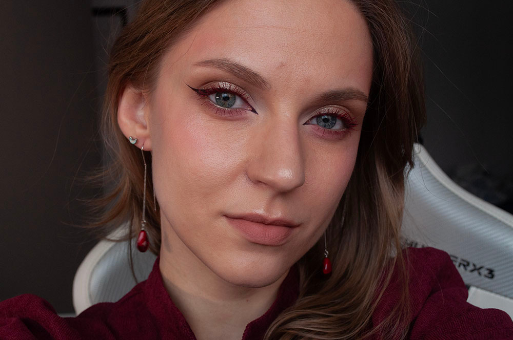 В бордовом цвете в один слой немного просвечивают темные корни, а сами ресницы чуть тоньше визуально (из-за более светлого цвета, все логично), так что я точечно добавляю тушь в те зоны где мне не хватает цвета — конкретно тут наслоила на кончики центральной трети верхних ресниц, чтобы усилить цвет.