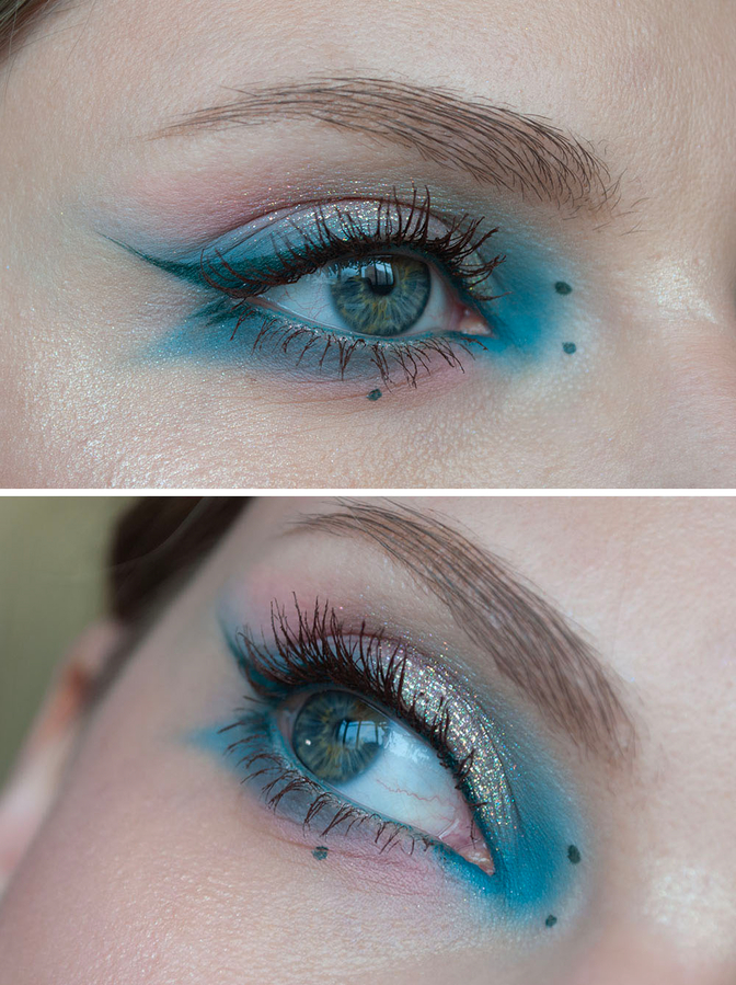 Оттенки тушей очень-очень красивые. Rich Brown реально коричневый, оттенок молочного шоколада, и на ресницах смотрится шикарно — заметно, но при этом мягче, чем смотрелась бы черная тушь. Мне очень нравится вписывать ее в контрастные мейки — как ниже на фотках, с бирюзовыми тенями, тогда оттенок становится еще более явным.