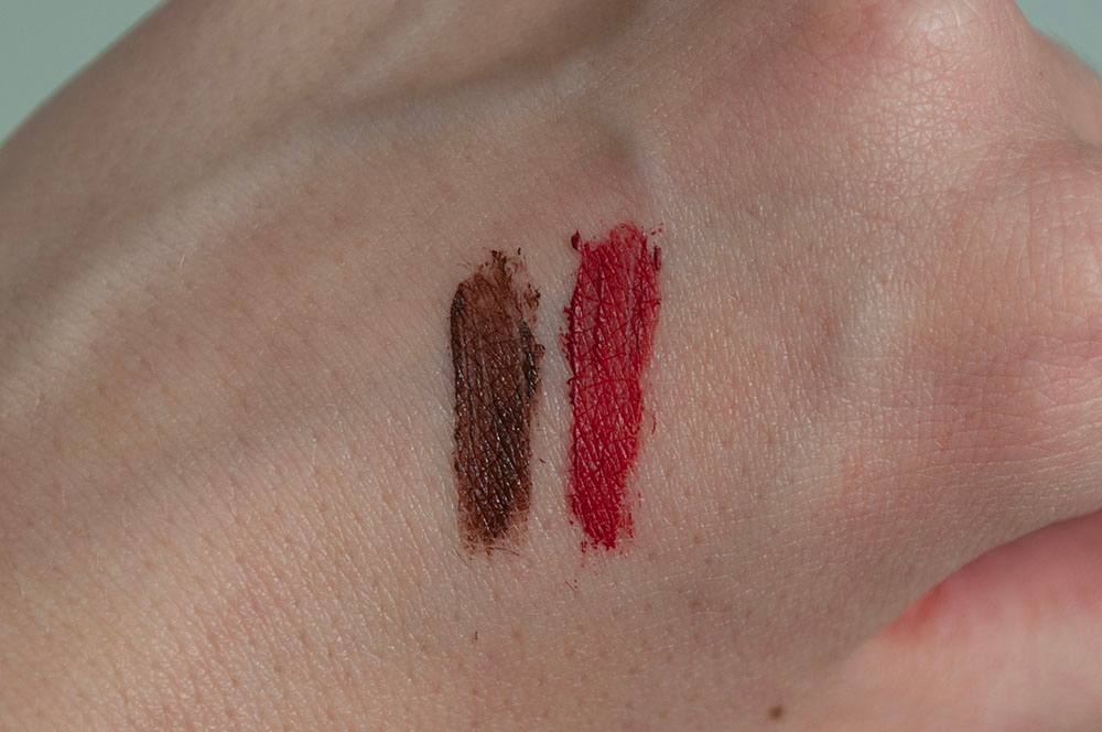 Мне лично это неудобно — я храню туши вертикально и смотреть на жопку каждый раз не хочу, так что на бордовой туши я нарисовала кружочек акриловой краской.