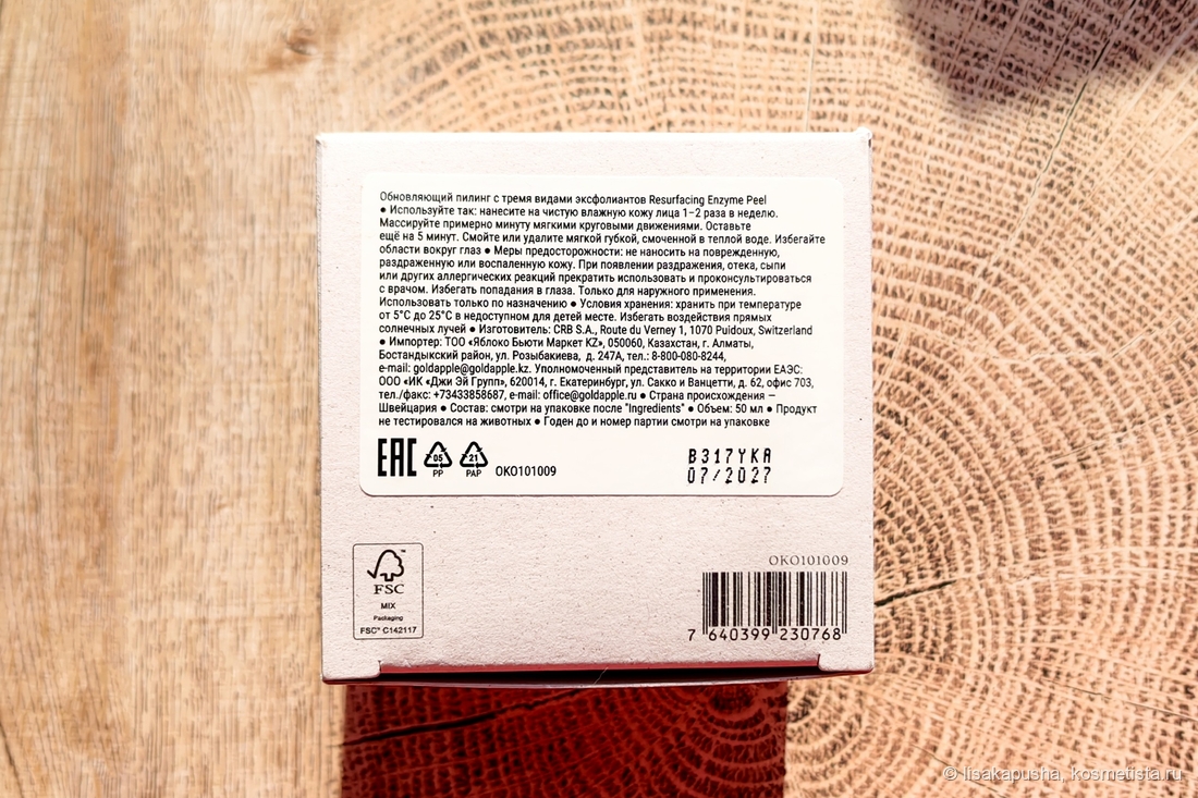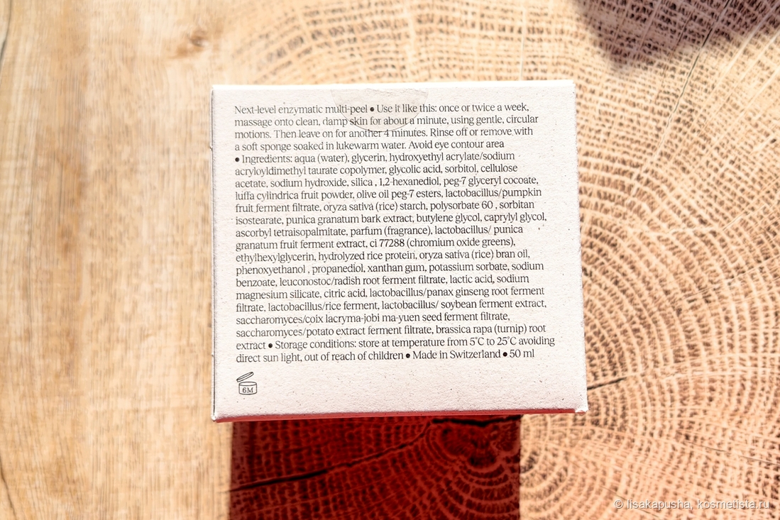 В данном продукте нет крупных частичек, поэтому отшелушивание происходит очень деликатно. Кожа не травмируется и не раздражается. В продукте много натуральных компонентов, которые не вызвали у меня неприятных ощущений, хотя кожа у меня чувствительна к раздражителям в виде отдушек.