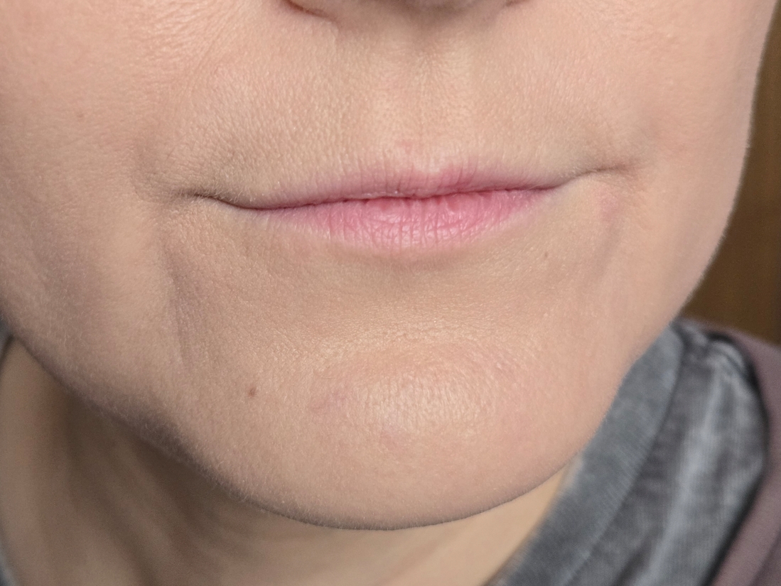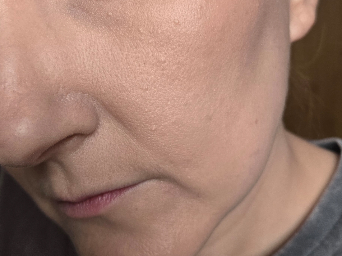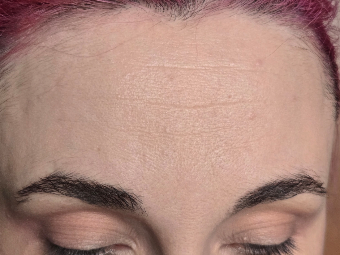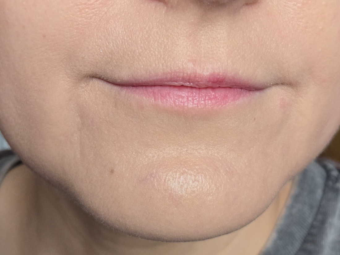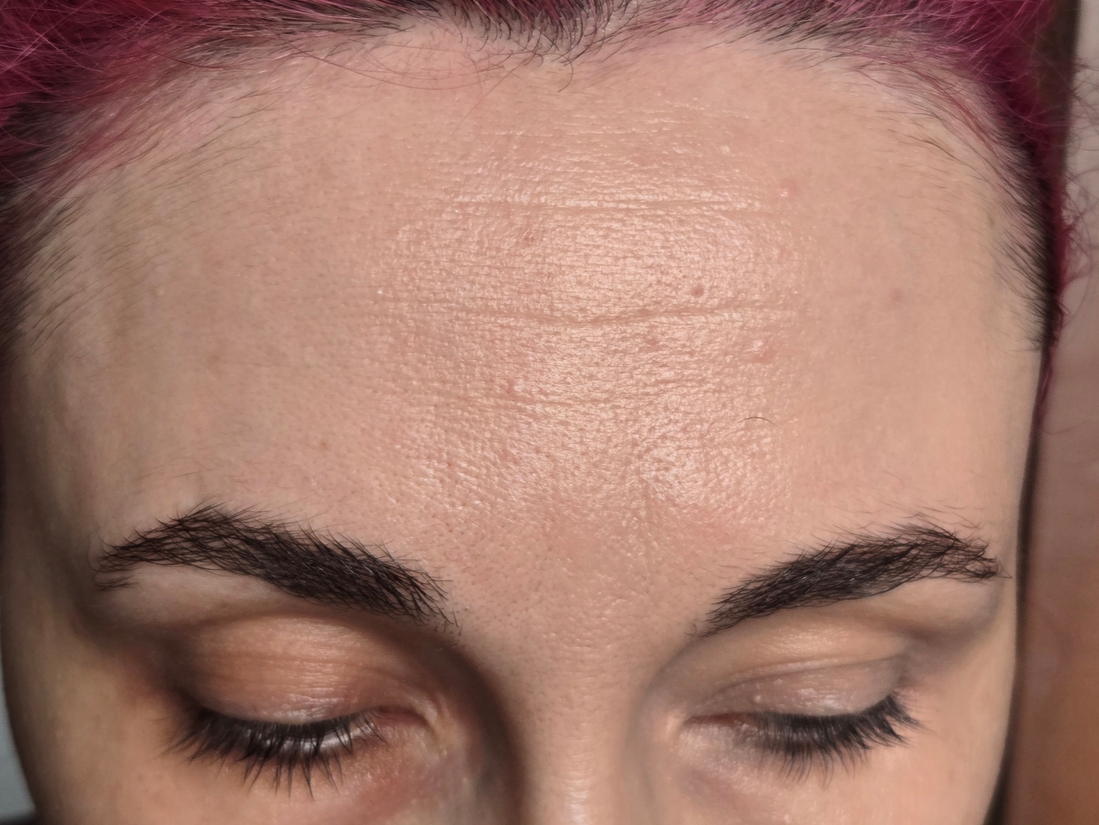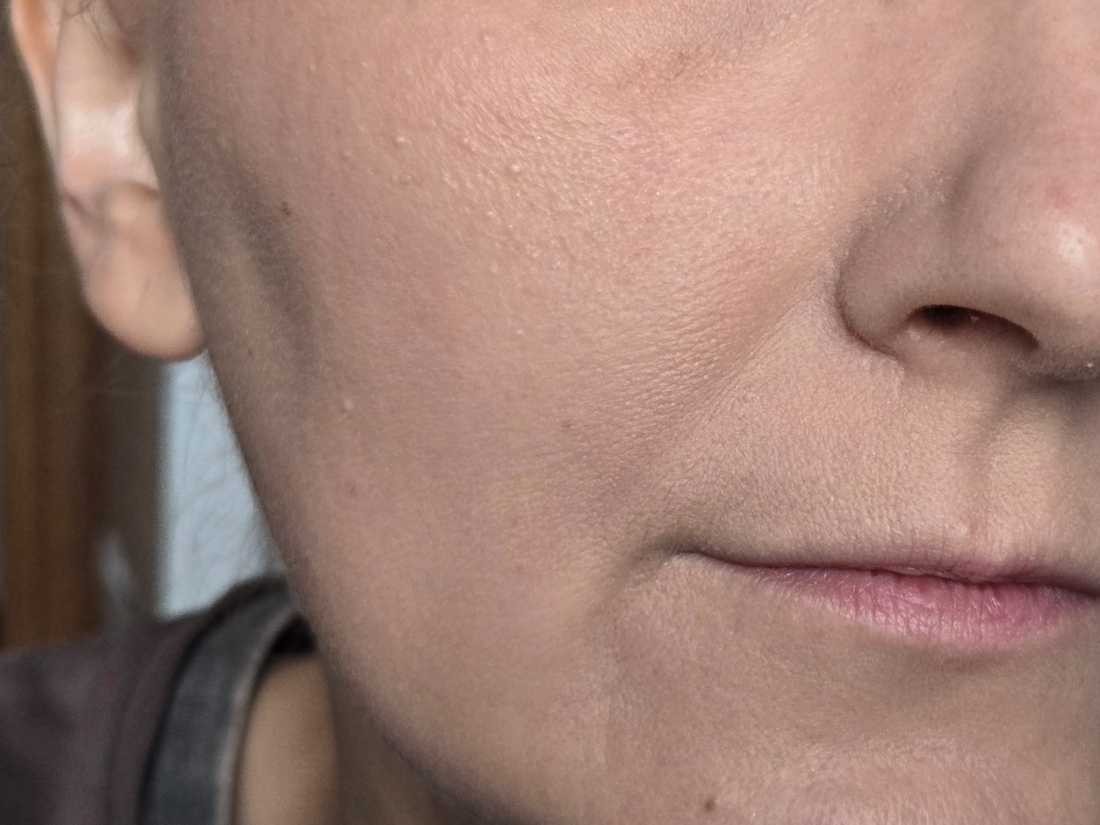 На лбу отлично видно, что в момент нанесения, крем ложиться хорошо, словно своя кожа только лучше, т.к. крем подстраивается под цвет кожи, немного высветляет и не уходит в серость.