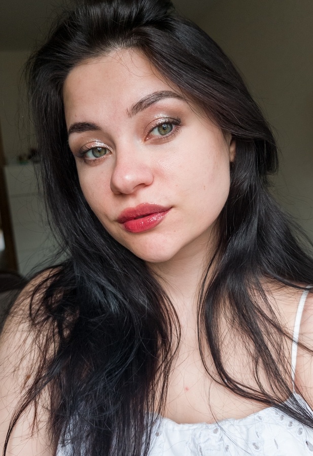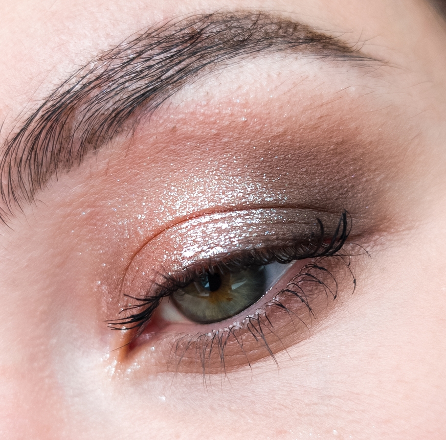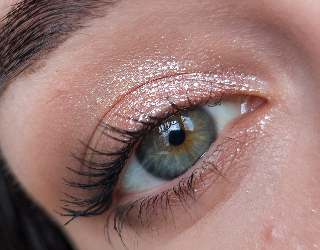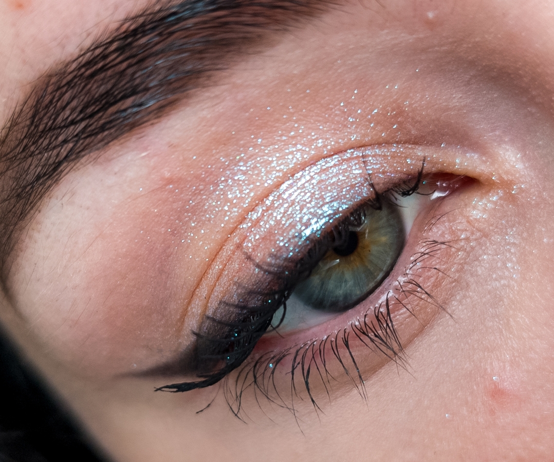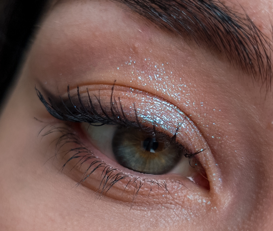 Спаркл я нанесла абсолютно на голое, неподготовленное веко, слегка растушевала в складке и добавила стрелку из теней. Никакой подложки, а как сияет!