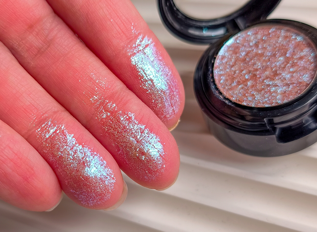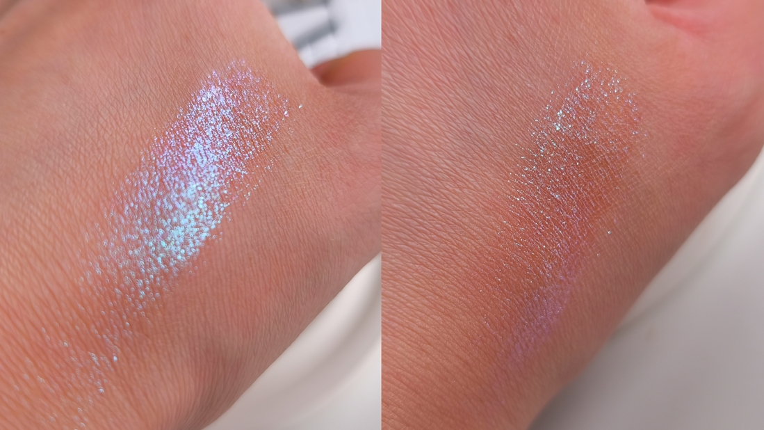 Это почти прозрачная, красновато-телесная база с многогранным переливом от голубого и бирюзового до сиреневого. На глазах этот оттенок выглядит максимально динамично, с одной стороны можно увидеть просто голубоватые блесточки на прозрачной базе, а с другой фантастическое сияние, как у рыбьей чешуи. Если что, то краснинка в макияже не проявляется, я бы описала этот оттенок как преимущество голубой.