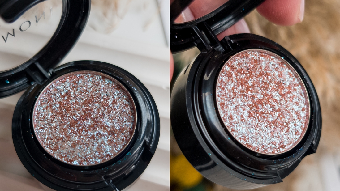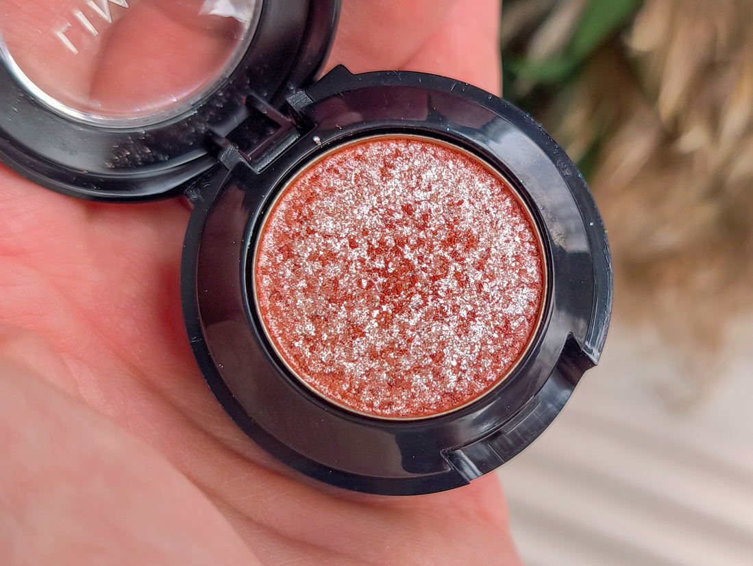 Спаркл довольно плотно спрессован, не разлетается и можно сказать, что и не осыпается под глаза. Не жирный и очень тоненький, шиммер мелкий, но его много. Кожу века не перегружает, не жует и не скатывается.