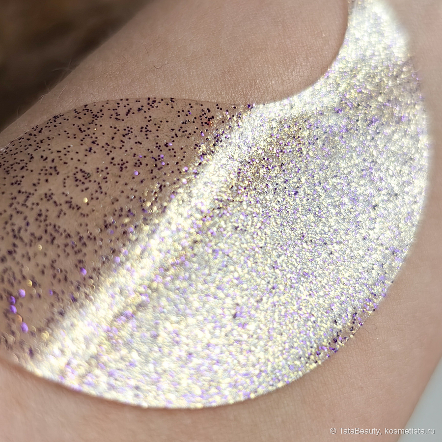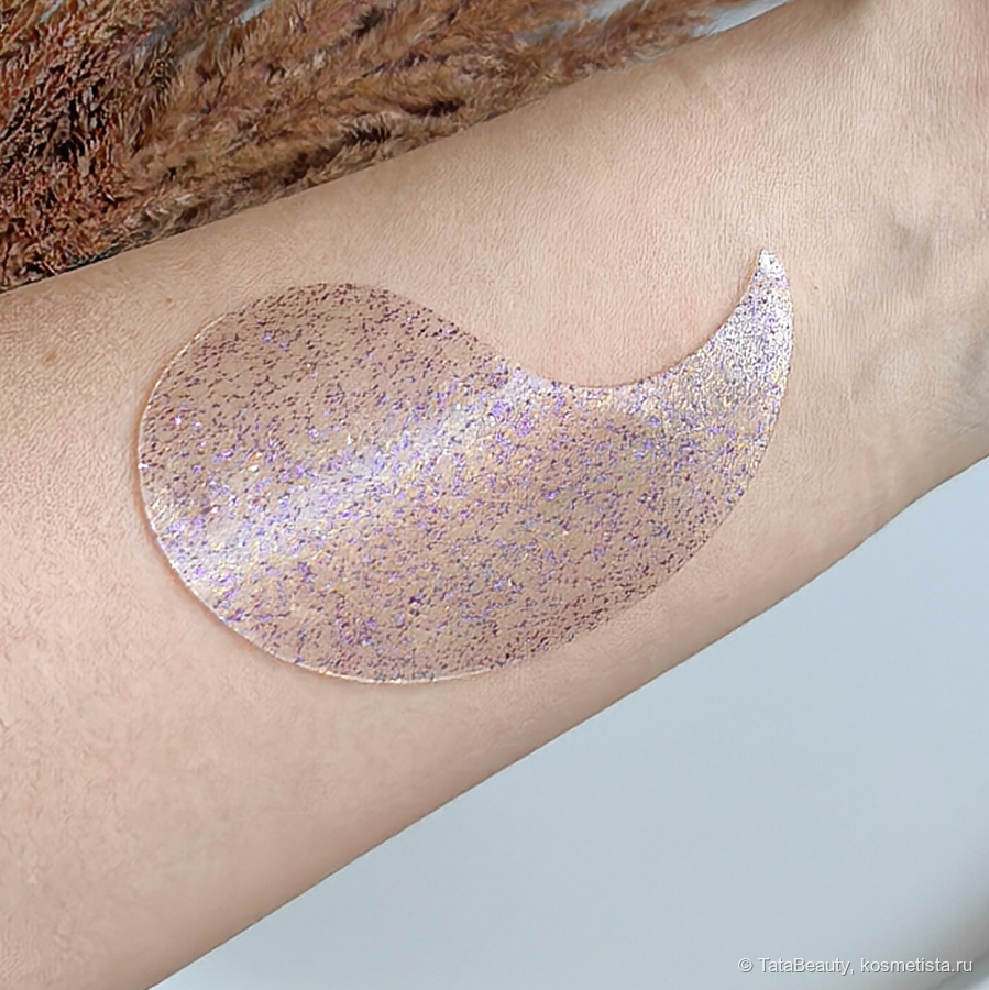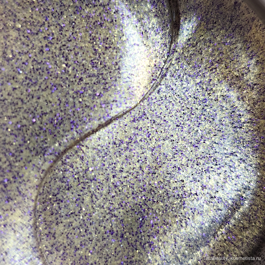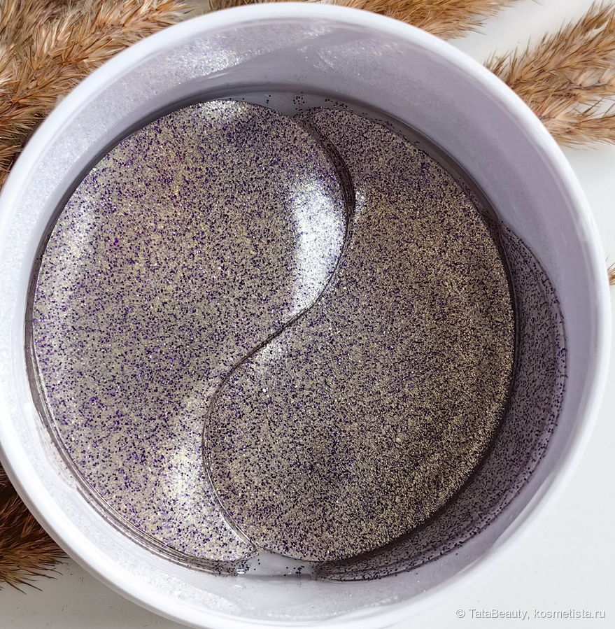 У патчей совершенно стандартная форма листка, я у таких всегда открываю тонкий край, так как он лезет в глаз. Выглядят патчи интересно, они полупрозрачные с фиолетовыми, золотыми и серебристыми блёстками. Особенность патчей в том, что они тонкие (тоньше, чем белые патчи от этого же бренда), может, из-за этого они практически не сползают. Патчи упакованы в стандартную круглую банку, где они сложены в две стопки, также есть сыворотка. Под основной крышкой есть вторая, к которой крепется лопатка. Оформление симпатичное в фиолетовых тонах. Есть приятная лёгкая кремовая отдушка.