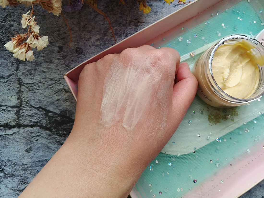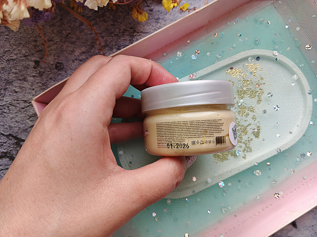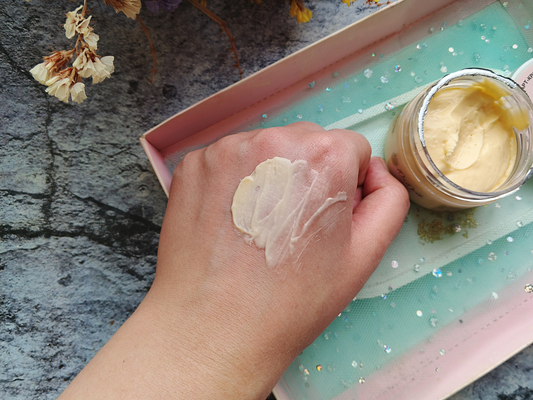 Текстура необычная — что-то среднее между гелем и кремом. Цвет у неё как у сгущёнки. Липкости нет. Тестура лёгкая, нежная и бархатистая.