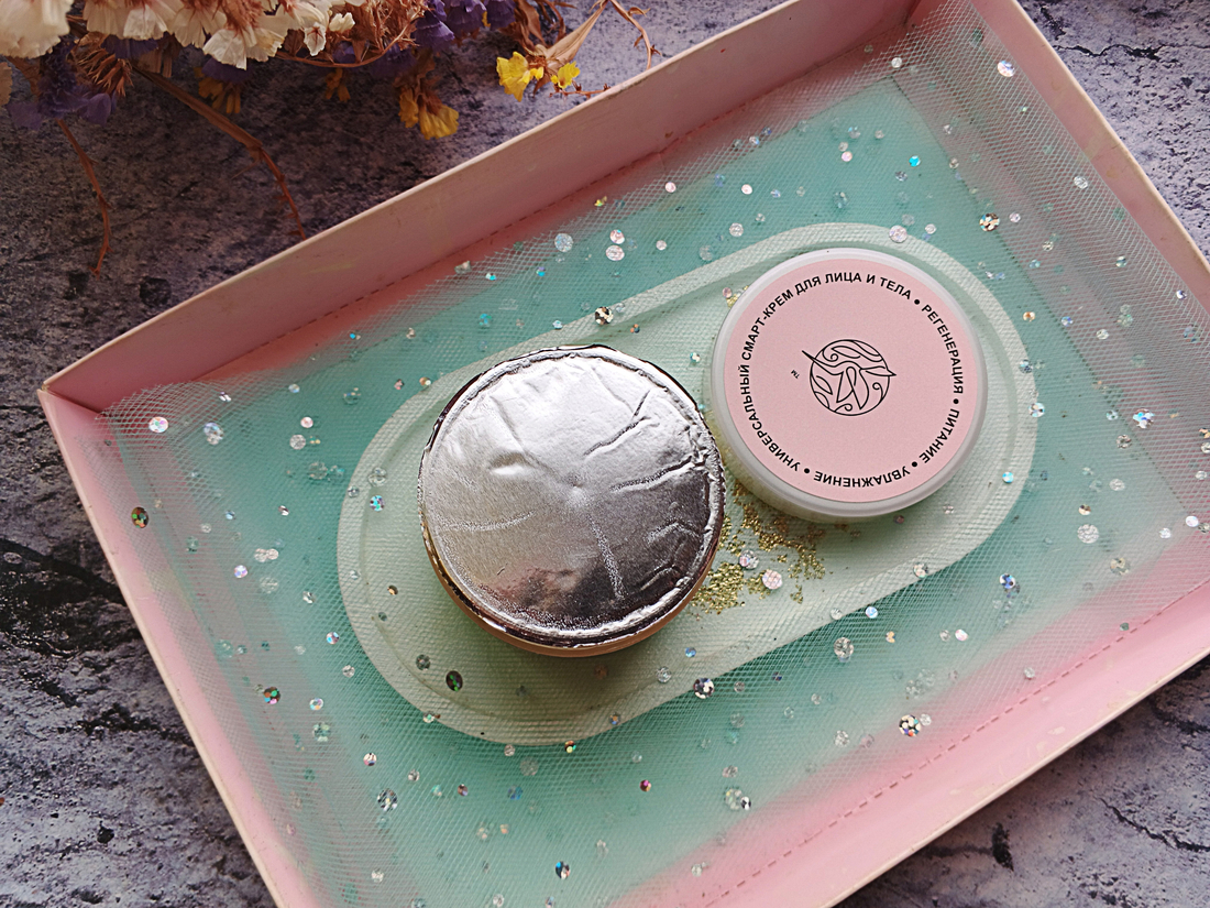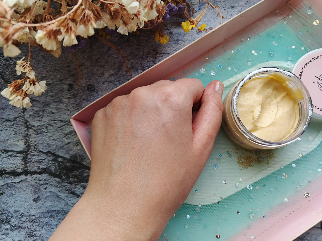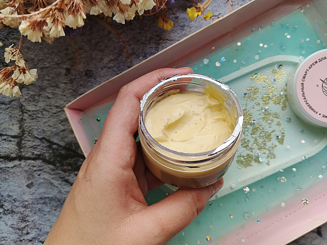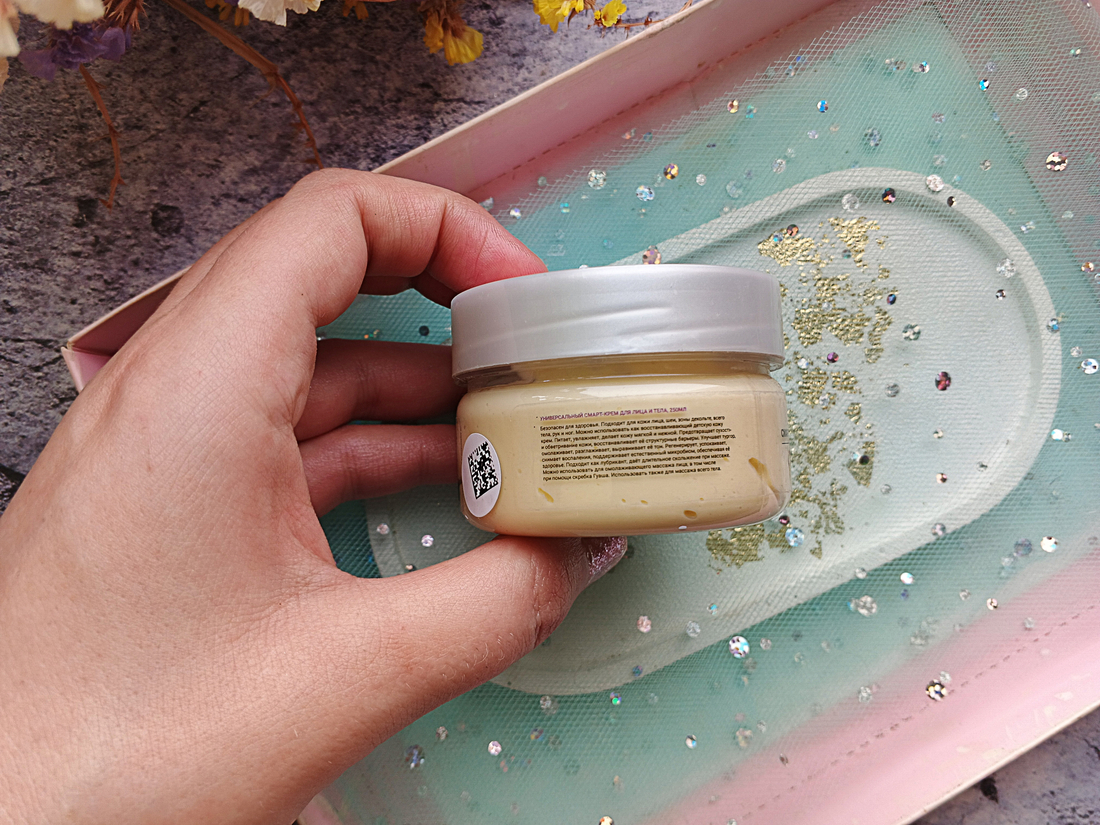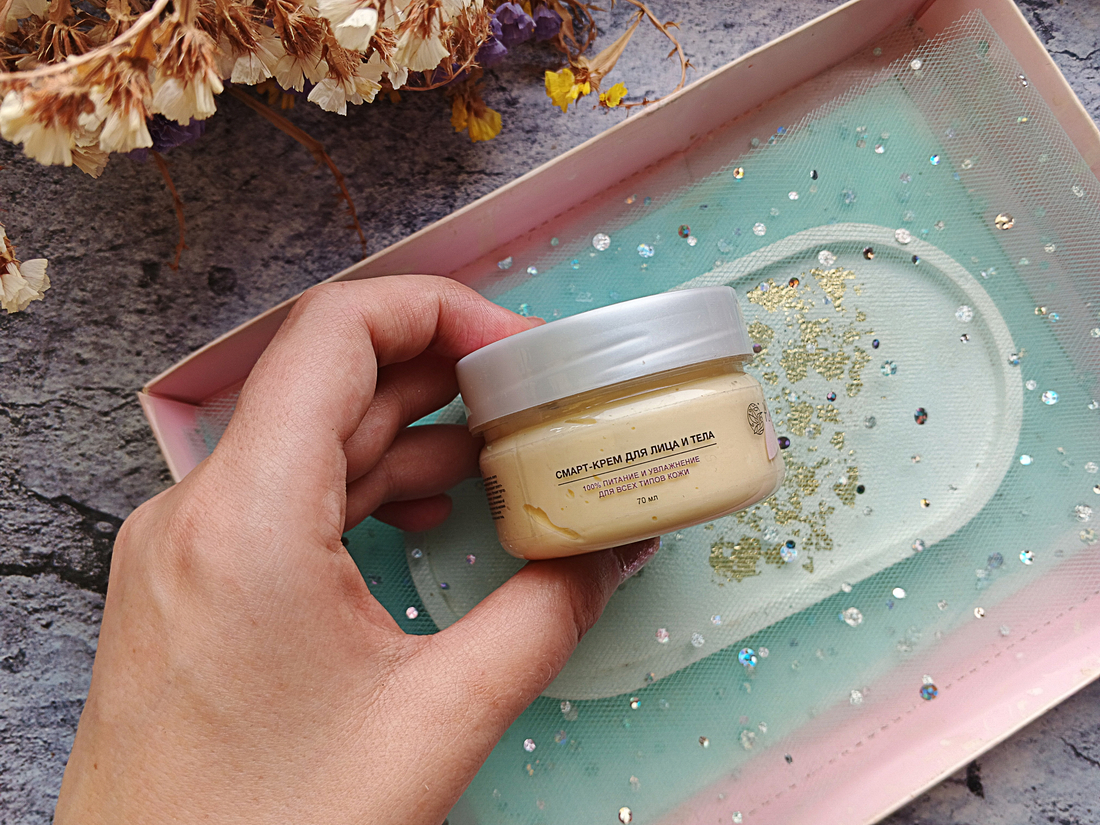 Мне не нравится отдушка смарт-крема, а также то, что он долго впитывается и оставляет жирный блеск на коже. По сути, это тот же баттер, но с «обманчиво» воздушной текстурой. Кожу он увлажняет не так интенсивно, как хотелось бы, при избыточно нанесённом количестве может скатываться. Баночка удобная, конечно, но само средство на любителя.