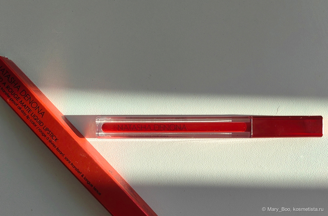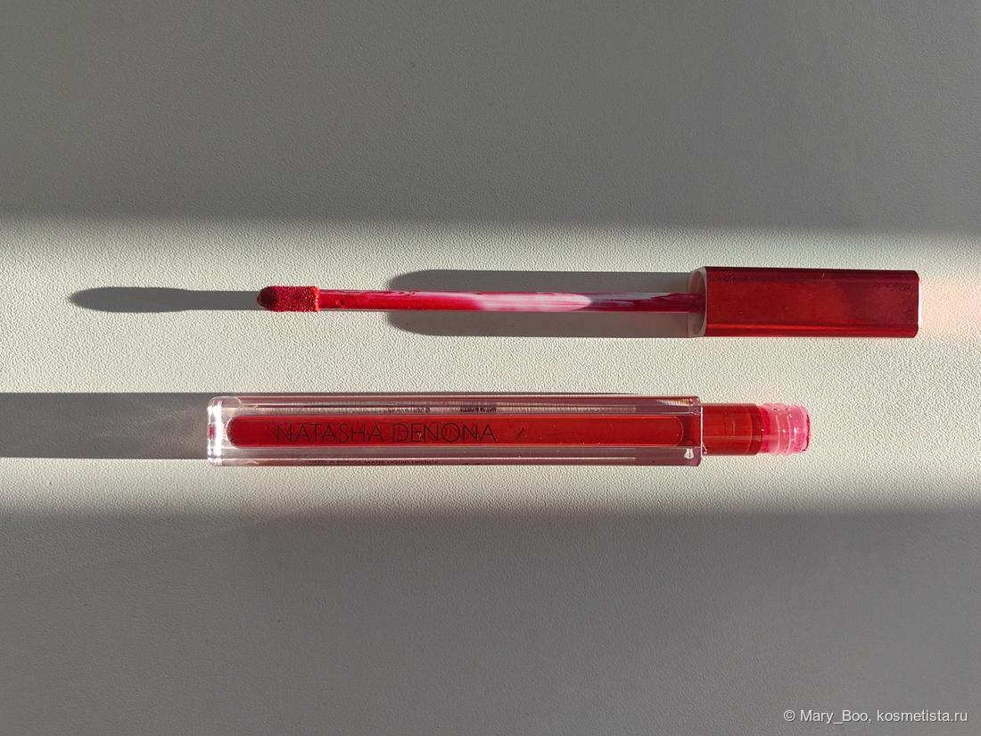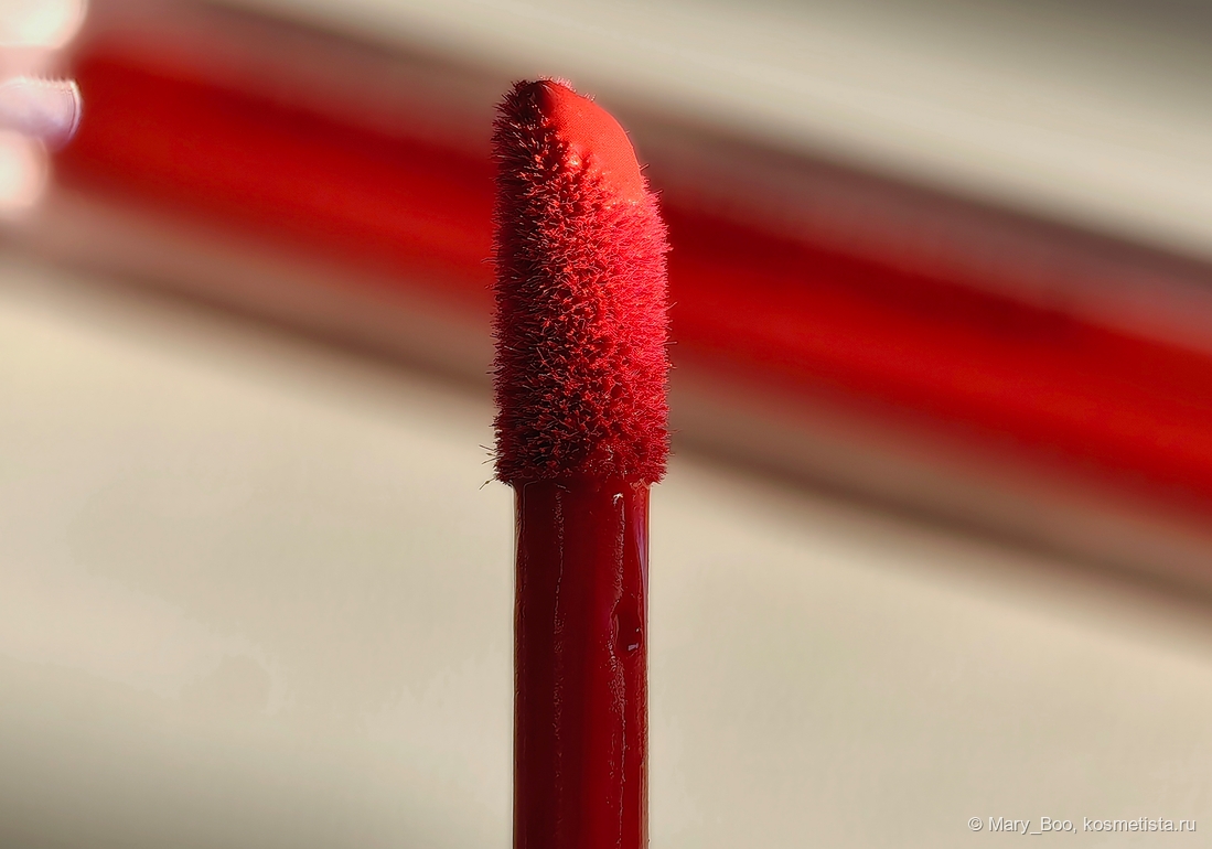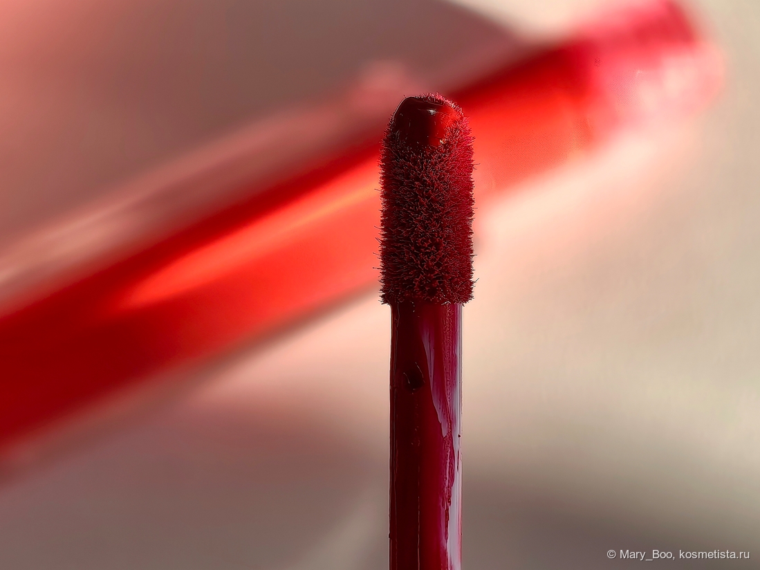 На аппликаторе остановлюсь подробнее, потому что тут начинается магия вне Хогвартса. Он небольшой и очень тонкий, срез — обычный. Ворсинки довольно короткие и не особо мягкие. Казалось бы аппликатор и аппликатор, что тут особенного? А в этот момент подключается текстура у помады — жидкий крем, намертво фиксирующийся буквально за минуту.