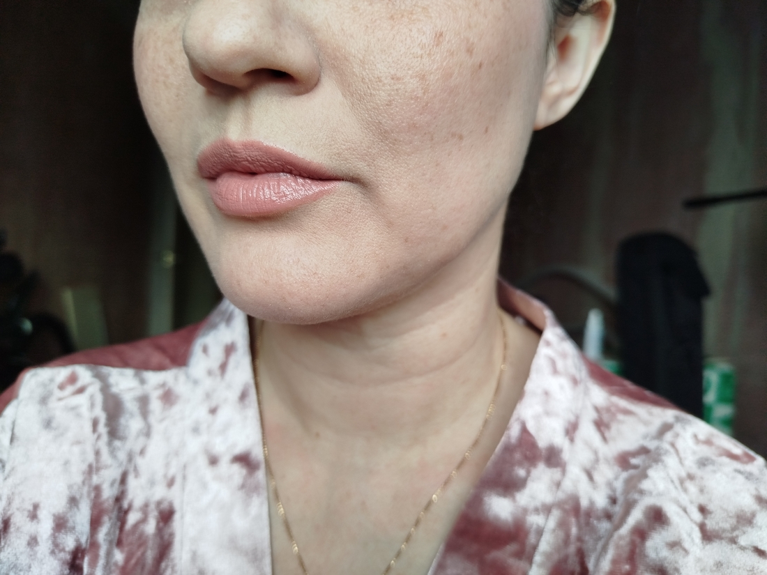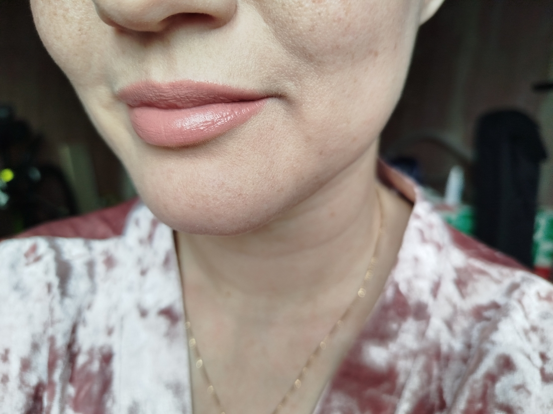 Мягкая и нежная консистенция, тающая. На губы ложиться ровно, не скатывается. Держится до первого перекуса точно.