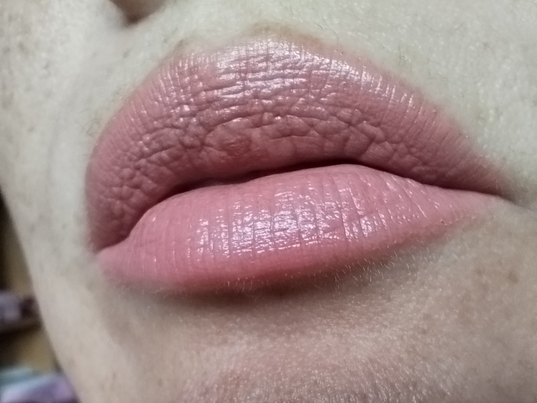 Содержит мельчайший золотистый шиммер. На губах выглядит не слишком перламутровым, сатиновым и спокойным. Если эти слова применимы к данному оттенку.