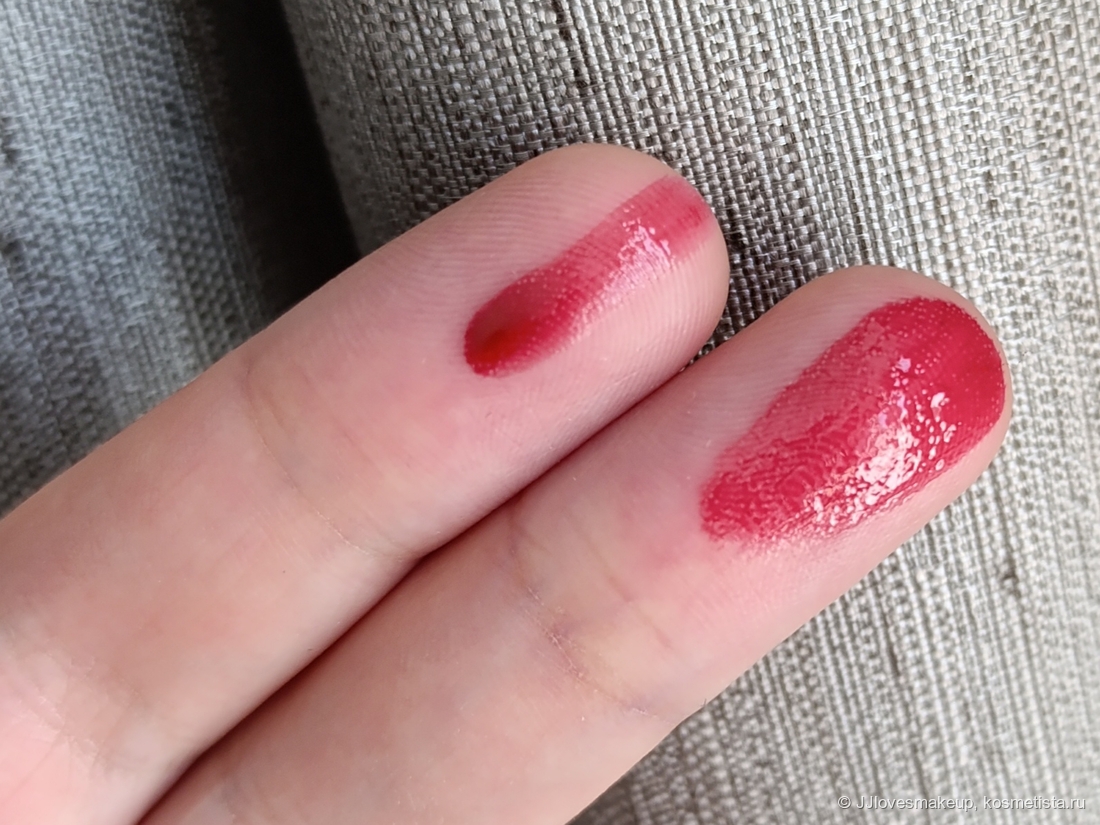 Стойкость: блеск держится часа три, постепенно впитываясь, оттенок остаётся, немного бледнеет, глянец уходит до «как от гигиенички», если при нанесении контур не растекся, то уже не растечется, уголки тоже. Перекус переживает наполовину. Но вскоре после нанесения лично у меня блеск собирается в цветную полоску: