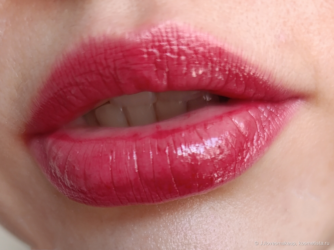 Поведение в процессе эксплуатации: похвалю уходовые свойства и эффект увеличения губ (визуальный, естественно), а также их разглаживание. Липкость средняя, ближе к низкой. Но вот эта полоска на слизистой перечёркивает все хорошее...