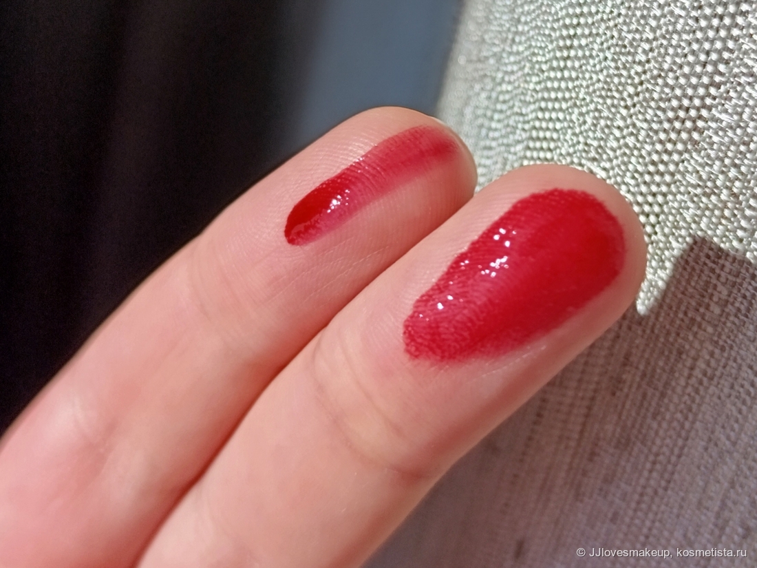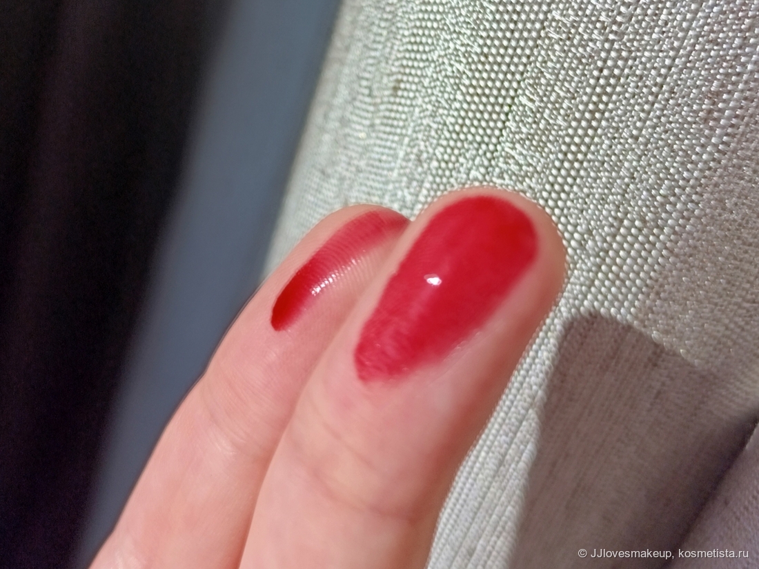 Удобство нанесения: средненькое. Тонким слоем наносится нормально, а вот плотным уже сложно- в уголках не четко, контур не прорисовывает, аппликатор слишком толстый для узких участков, блеск ложится немного неоднородно на поверхности губ… Повторюсь, с тонким слоем этих проблем нет. Но я люблю слой поплотнее.