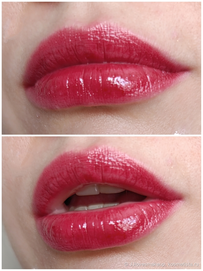 Плотность/прозрачность: достаточно прозрачный, текстура губ просматривается, родной цвет уже нет.
