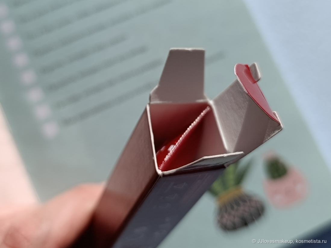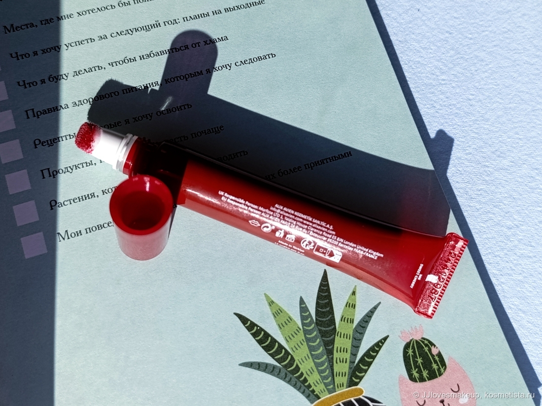 Ощущение от применения: такое себе. Тюбик яркий, позитивный, но пластик тонковатый, в руках ощущается бюджетно, аппликатор не самый удобный. Приятная текстура, вкусный запах и мгновенное увлажнение губ немного компенсируют недостатки, но не полностью. В принципе, можно было бы пользоваться, и даже с определенным удовольствием, если не одно «но». Существенное «но», о котором ниже.