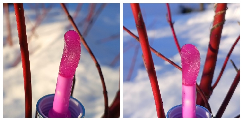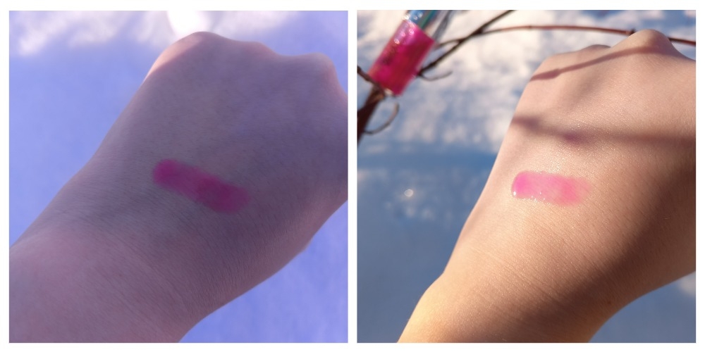 Оттенок у масла холодный, розово-лиловый. На коллаже ниже слева оттенок в дневном свете, справа под прямым солнцем. Он не теплеет. И хорошо видно, как глянец размывает текстуру кожи. А глянец там яркий и заметный.
