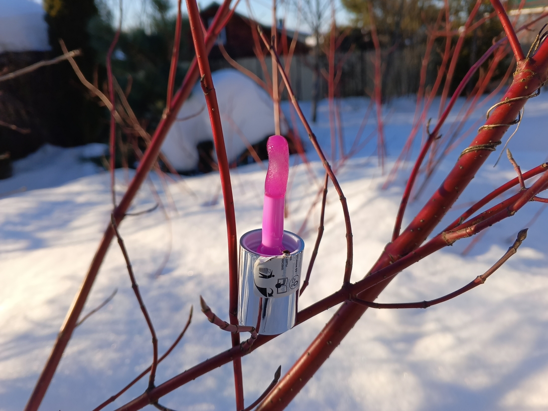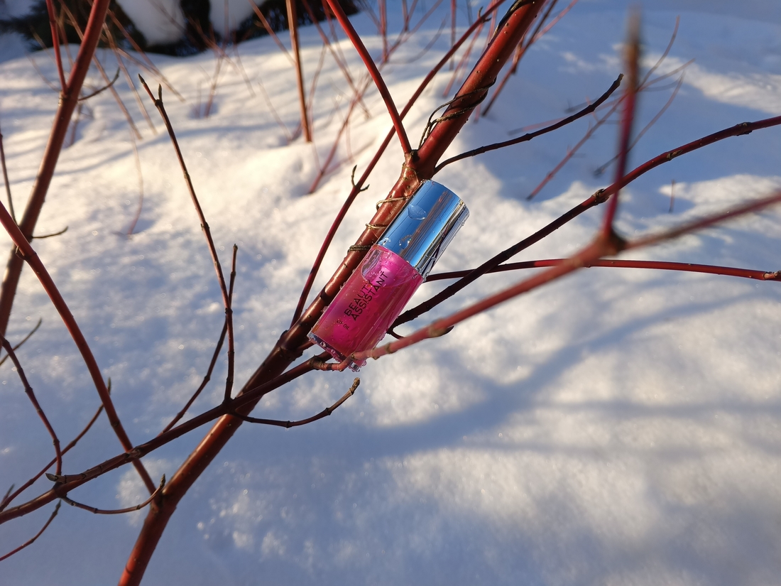 Масло приезжает в розовой глянцевой упаковке, на мой взгляд избыточной. На упаковке есть название и номер оттенка. У меня это 03 — самый холодный лиловый. Есть еще два оттенка, розовые, похолоднее и потеплее.