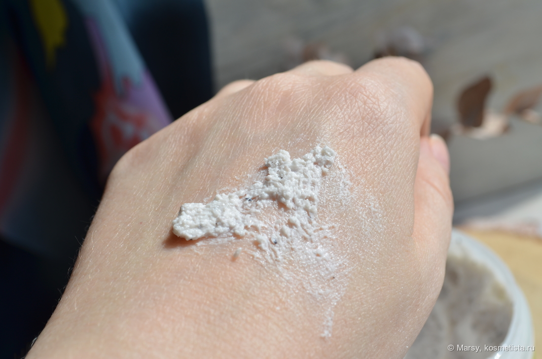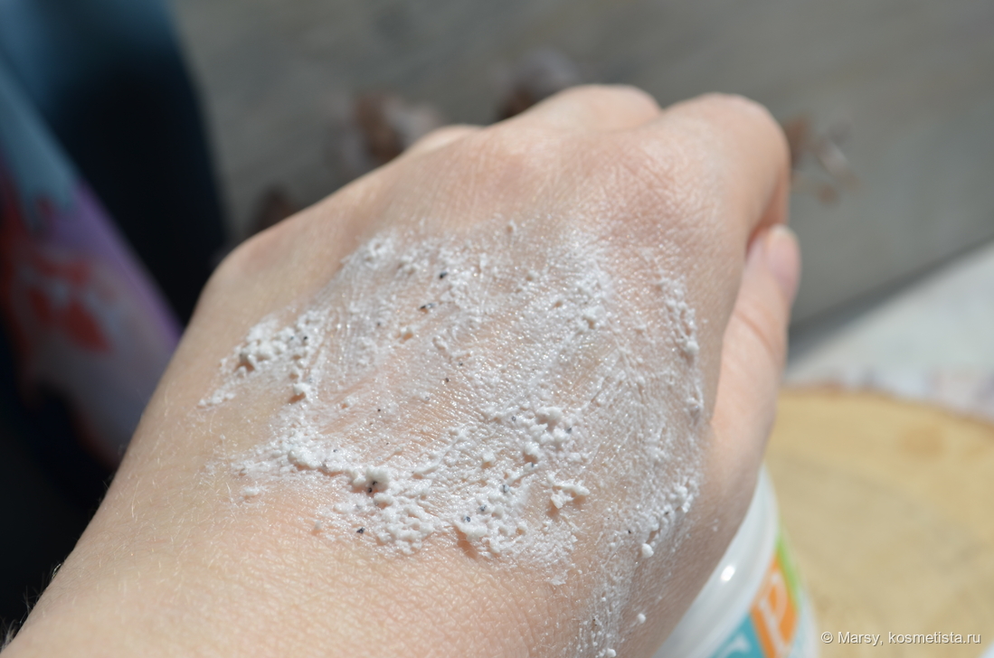 Скраб белого цвета с редкими вкраплениями абрикосовых косточек. Аромат кремовый с фруктово — молочными нотами, очень лёгкий и практически не ощущается. Текстура лёгкая, взбитая с мелкими сферическими частицами полимера, при распределении они ощутимы, но не царапают, похоже на процесс микродермабразии.