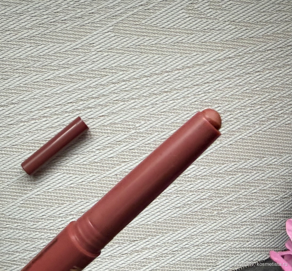 Вес у продукта небольшой — всего 1,2 г. Корпус выполнен в оттенке самой помады, крышка защелкивается надежно. Отдушка приятная: что-то между шоколадом и легкими пряностями, но на губах она практически не ощущается.