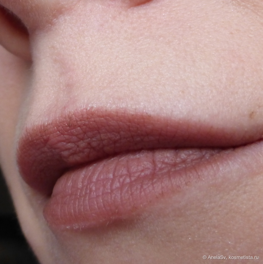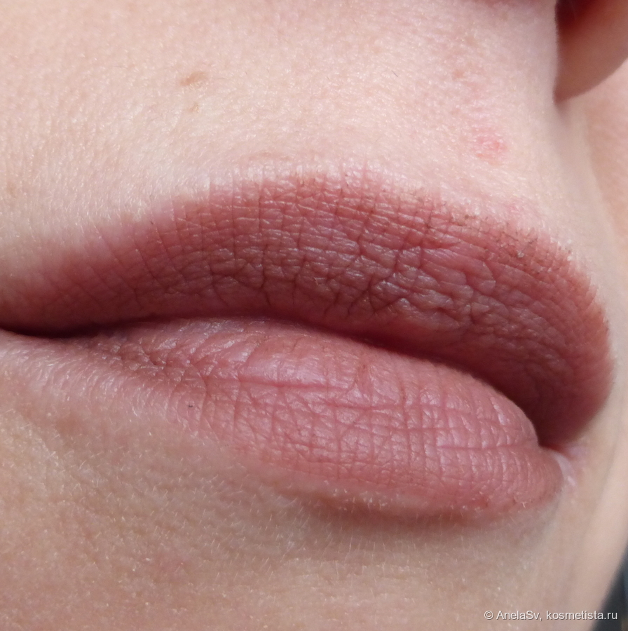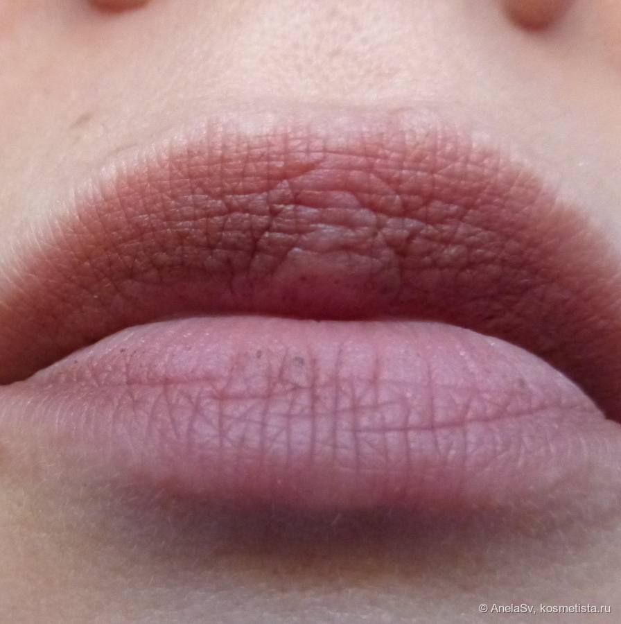 Оттенок — холодный нюд с коричнево-лиловым подтоном. Смотрится очень естественно, но при этом не скучно — отличный вариант на каждый день. Помада хорошо ложится даже на неидеальные губы, не подчеркивает сухость и шелушения.