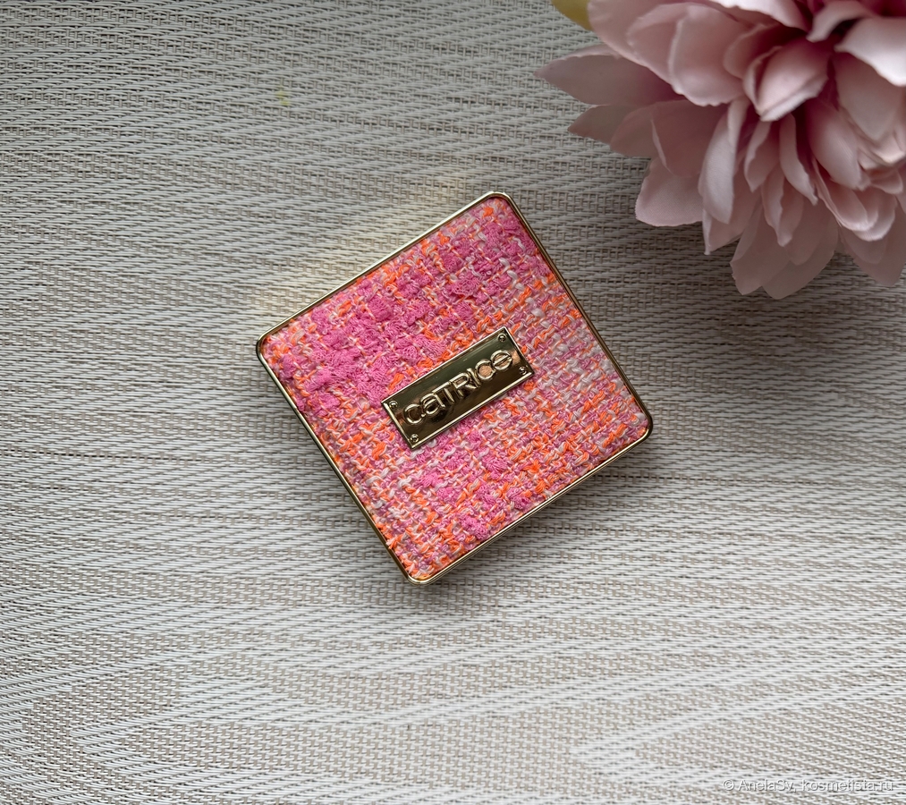 Упаковка получилась эффектной: увесистый пластиковый футляр (6,4 г продукта) с тканевой крышкой, оформленной под твид в розово-оранжевой гамме. Есть защита от вскрытия, внутри — удобное зеркало хорошего качества.
