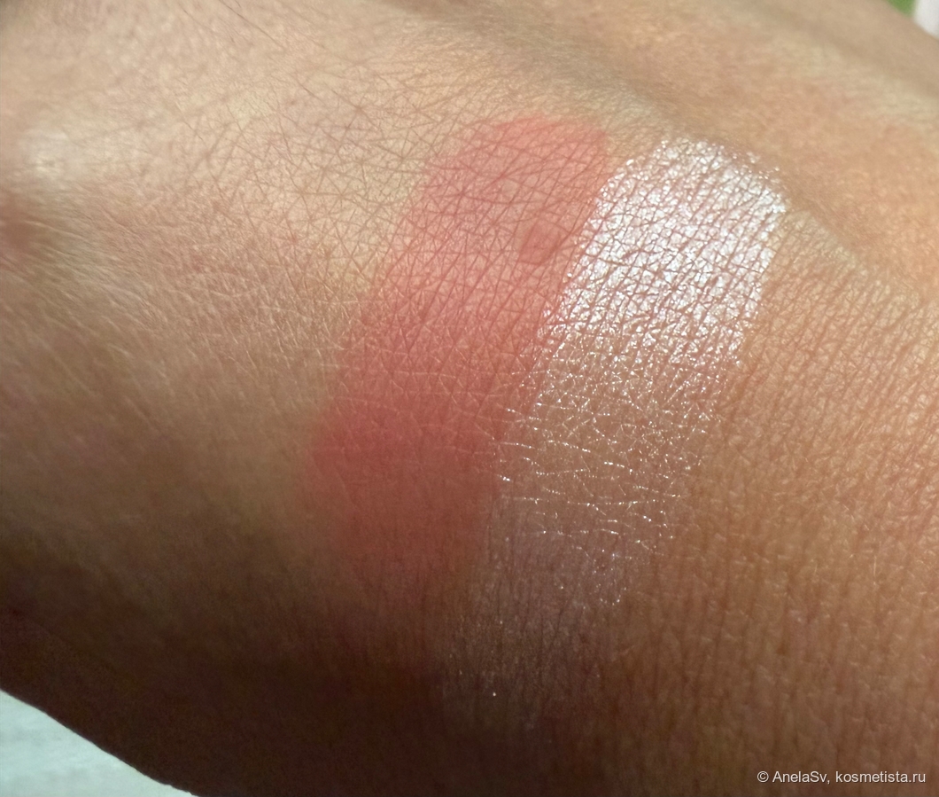 Внутри два равных по размеру отсека. Хайлайтер — кремовый, светлый, с жемчужным отливом и розоватым подтоном. В текстуре заметны отдельные блестящие частицы. Честно говоря, он меня не впечатлил: сразу после нанесения выглядит красиво, но спустя пару часов остаются в основном лишь блёстки. Продукт не фиксируется, хотя и не ощущается жирным. Наносить удобнее всего пальцем. Пробовала использовать его и на веках — результат неудачный: собирается в складках и выглядит неаккуратно.