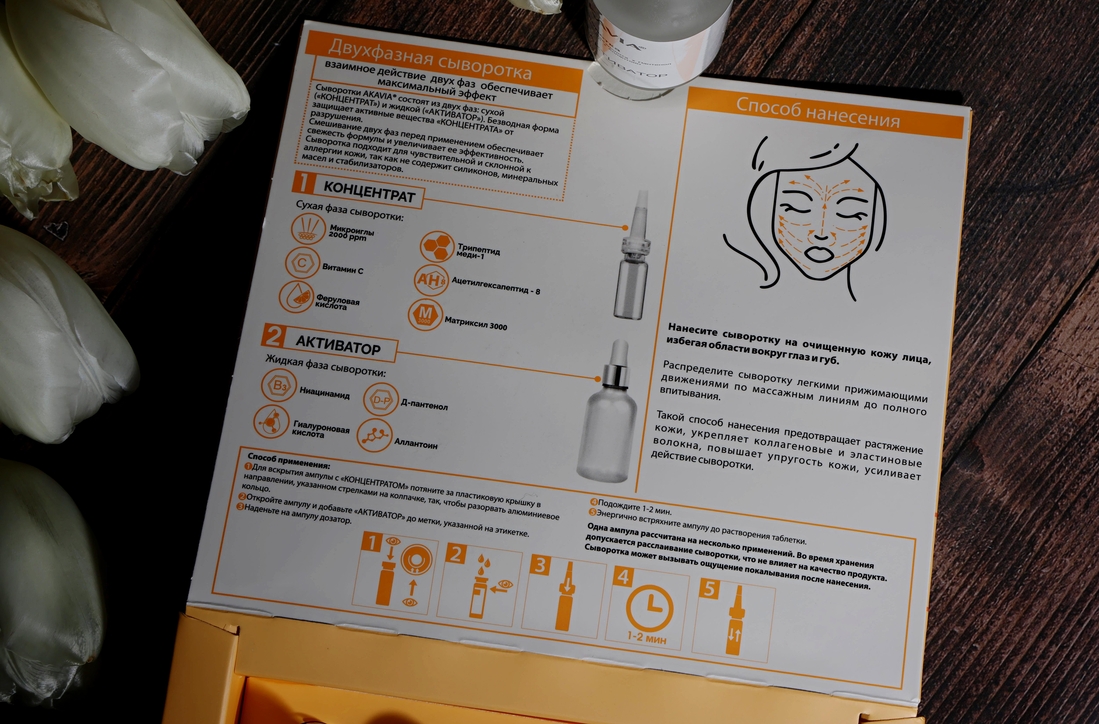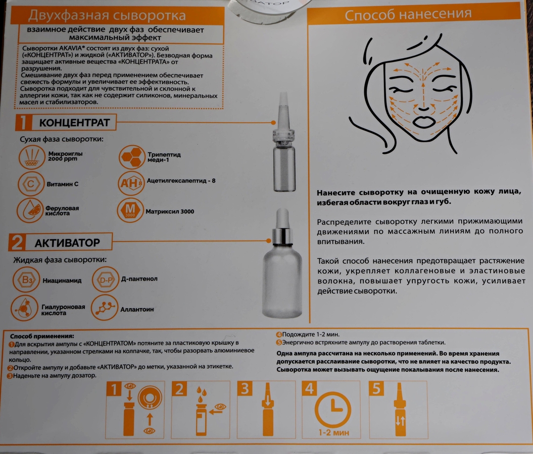 Внутри коробки сыворотка-активатор в матовом стекле с пипеткой в объёме 50 мл, прозрачная, бесцветная и с легким каким-то цветочным что ли ароматом. И 12 ампул с сухим веществом. Открыв сначала коробочку, я подумала, как же мне 12 ампул должно хватить на 14 дней. Но опасения мои оказались беспочвенны — каждой ампулы хватает на 4-5 раз. И это если не экономить. Кому-то и на дольше хватит. Я традиционно люблю наносить достаточно, чтобы руками не по сухому лицу водить, да и под подбородок тоже. С некоторых пор мои прыщи переехали туда.