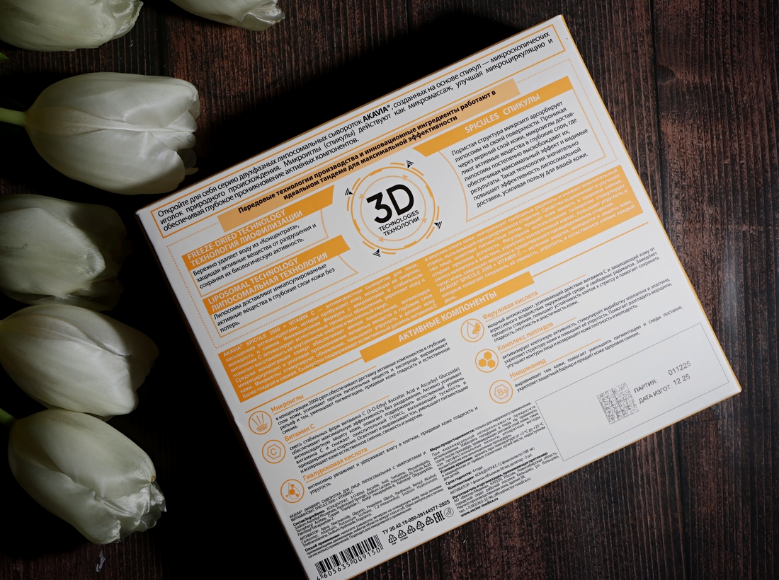 Картонная матовая коробочка, запаяна в п/э. Довольно плотная — я потом так внутри всё и хранила, получилось удобно. Состав, инструкция и вся информация — внутри коробки на крышке и сзади. Что привлекло меня? Витамин С хорошо работает на моей проблемной коже, обычно с ним кожа у меня выравнивается по тому, воспаления или не возникают, или быстро сглаживаются. Гиалуроновая кислота для увлажнения, которого мне часто не хватает, ниацинамид опять же для борьбы с воспалениями и пигментацией (пятна постакне — моя тема). Также феруловая кислота и яркий компонент последних полутора-двух лет — микроиглы.