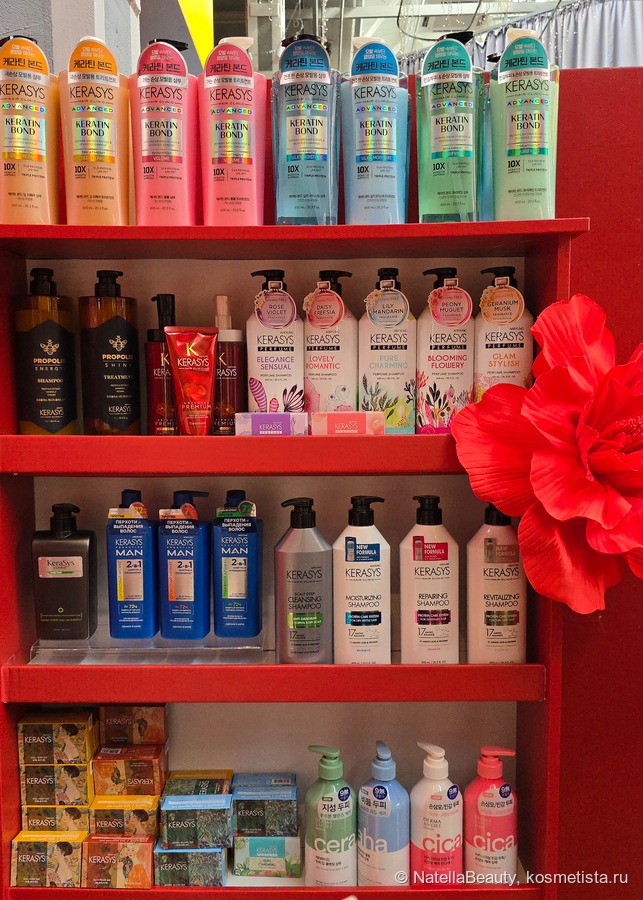 Мы переходим на вторую линию и здесь нас встречает яркий и красивый стенд Kerasys. Здесь богатый ассортимент корейских средств для волос, есть линейки как с направленным действием, так и парфюмерные (аромат популярных парфюмов) и линейка на основе меда. На будущее присмотрела себе линейку для блонда.