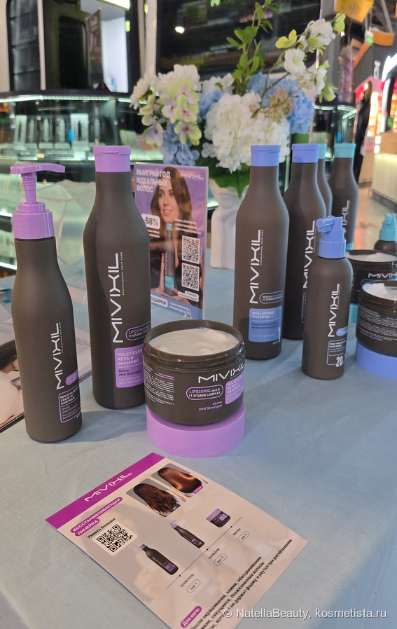 Рядом обосновался новый бренд по уходу за волосами — Mivixil. Это российское производство (г. Волгоград), бренд очень молодой, он открылся в конце 2025 года и уже представил три линейки по уходу за волосами: увлажнение, укрепление и реконструкция. На этом стенде работал трихолог, которая делала бесплатную диагностику волос и давала рекомендации по уходу.