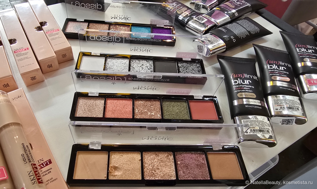 Здесь нас встречает много новинок: цветные туши для ресниц (синяя и бургунди), новые жидкие хайлайтеры в двух оттенках, тени-стики, линейка консилеров и палетки теней.