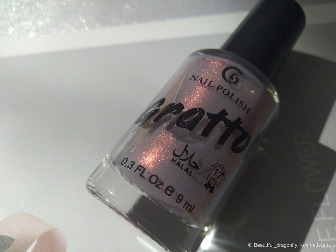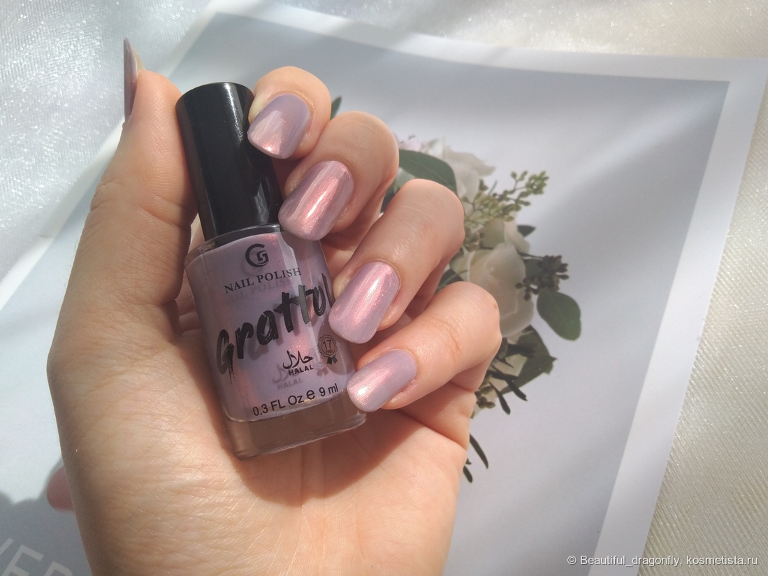 Лак в текстуре полупрозрачного креле серо-сиреневого оттенка с розово-золотым сиянием.