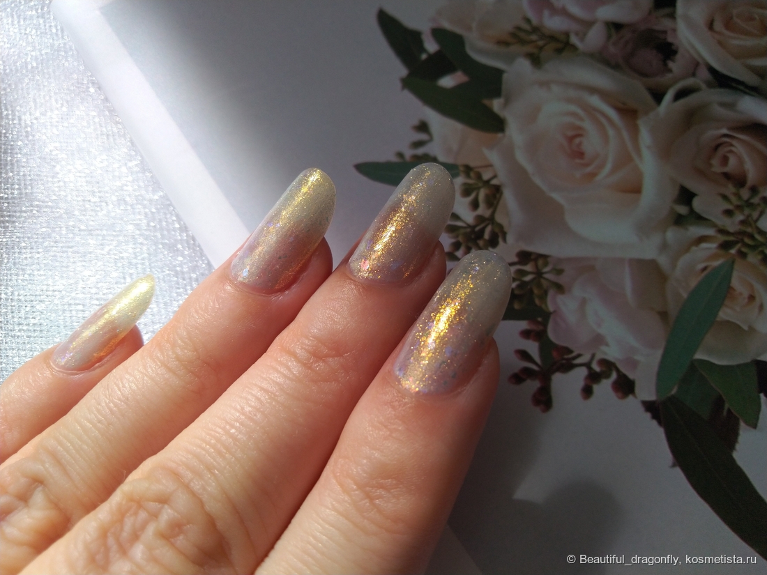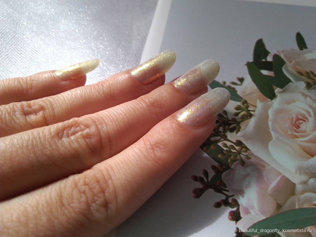 Если не пробовали лаки из данной коллекции, то получите мою искреннюю рекомендацию: они очень удобные и простые в использовании, ими легко поправить маникюр в течение недели, хотя с их прекрасной стойкостью необходимость в этом возникает не часто.Они красивые, нежные и воздушные с прекрасными переливами и свечением.