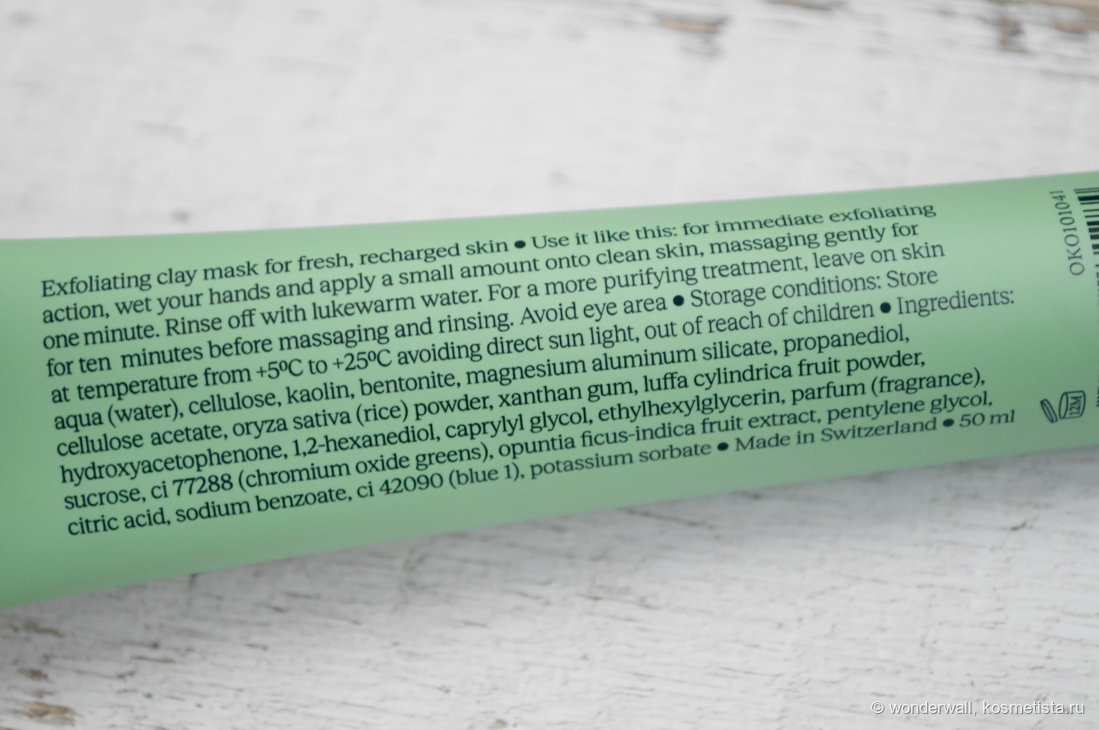 В составе белая глина, экстракт плодов опунции, волокна люффы и рисовый порошок.
