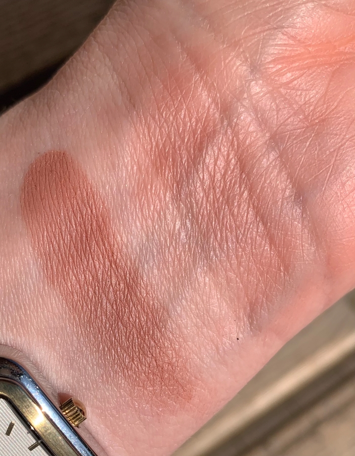 Оттенок: вот это самое интересное. Я ждала чего-то розового с бежевым подтоном, но фактически это бежевый, не побоюсь этого слова бронзер, с розовым подтоном. На мой взгляд, именно этот оттенок будет СОВЕРШЕННО по-разному ложиться на разные цветотипы и разный тон кожи. В пигменте есть красный цвет, румяна могут подчеркнуть красноту. Для меня оттенок уникален и более, чем удачный.