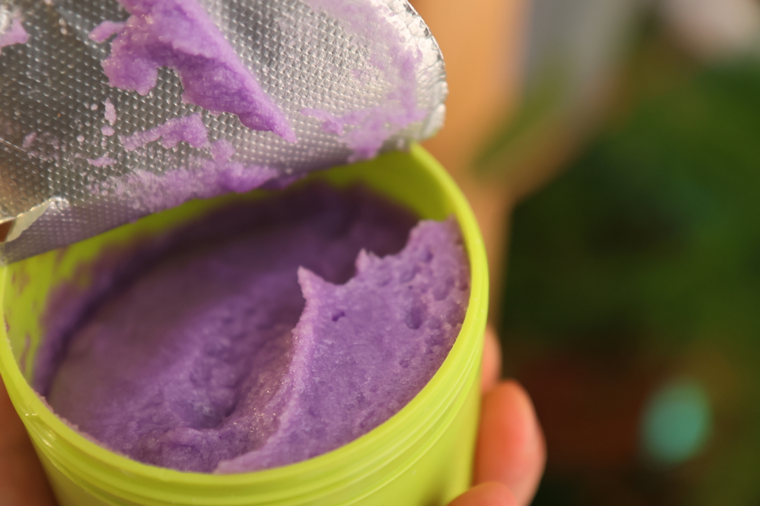 Фиолетовый скраб в прикольной банке. Для использования очень неудобен. Если наносить через сухие волосы — добраться до кожи головы сложно, но можно — перекидывая их туда-сюда, но расход бешеный. Если наносить через влажные — добраться до кожи головы невозможно, но зато расход снижается. Дилемма. В итоге я наносила на влажные после 1 или 2 мытья. Скраб с крупной солью, мылится довольно сильно, что было неожиданно. Наносила в основном по краям головы (внутрь не добраться), массировала без фанатизма. Вымывает так, что до скрипа, т.е. кондиционер/маска строго обязательны. Эффекта какого-то я не увидела. Пилинг с носиком удобнее и после него голова более легкая, а тут… как-то вот не оценила. Хватило на 4-5 раз. Не повторю. Но пахнет приятно, это да) Лавандой.